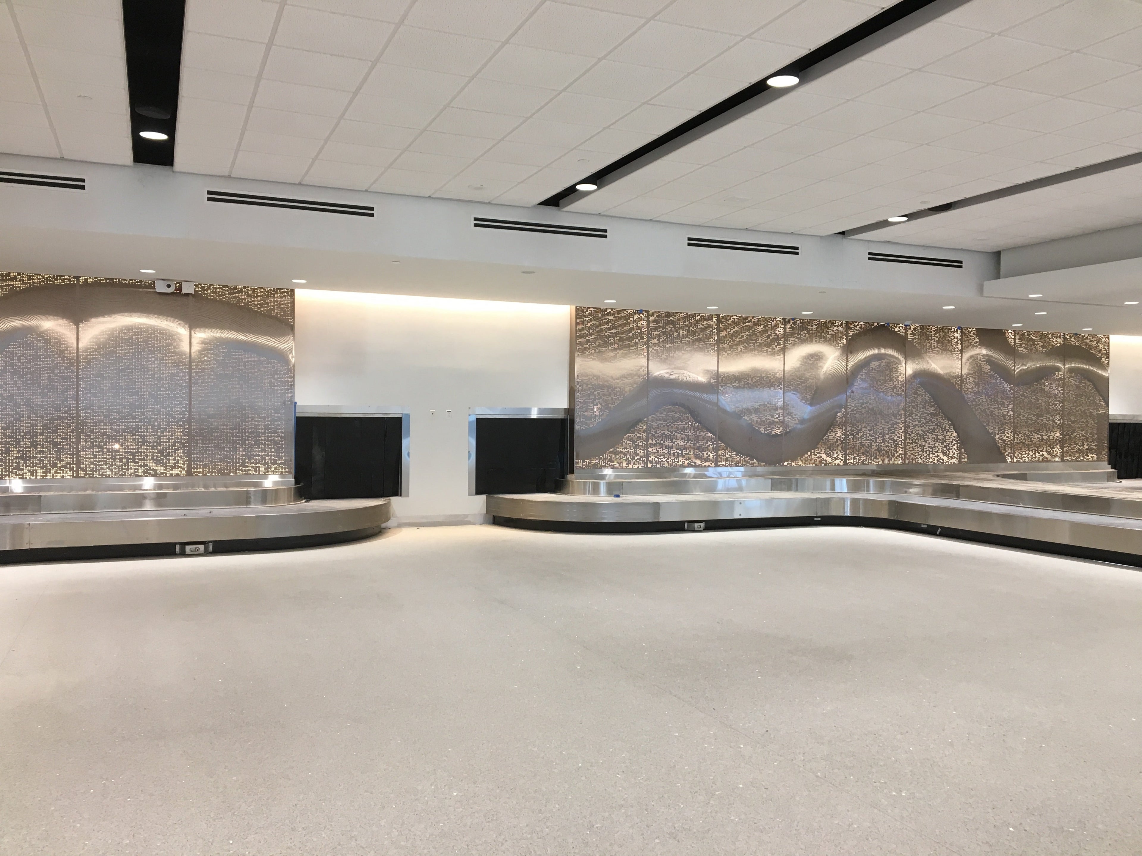 The baggage claim walls continue the Mississippi River theme. The area also has a stage for live music and travelers can buy alcohol at the liquor store located near the exits.