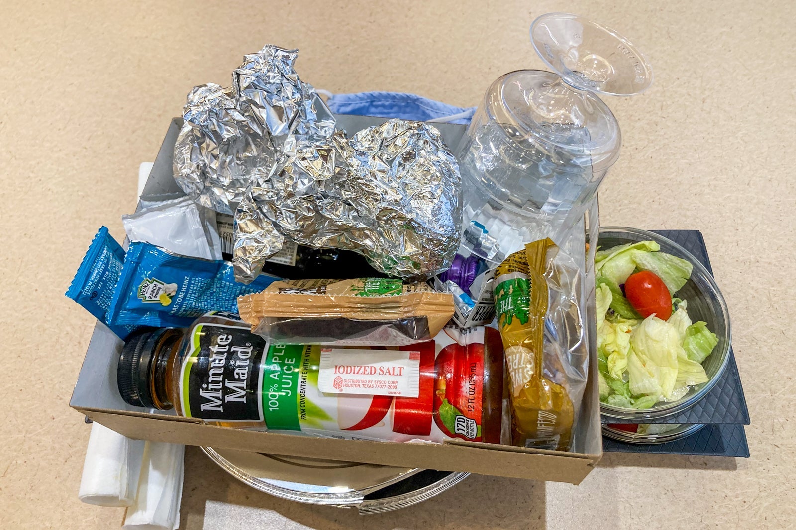 I have to admit: I was impressed. No, it was not like dining in a Michelin-starred restaurant, but I'd say the meal was comparable to a decent dinner in long-haul, international business class. I was especially impressed with how everything was neatly packaged in one-time-use containers, and it was just the right amount of food before bed.