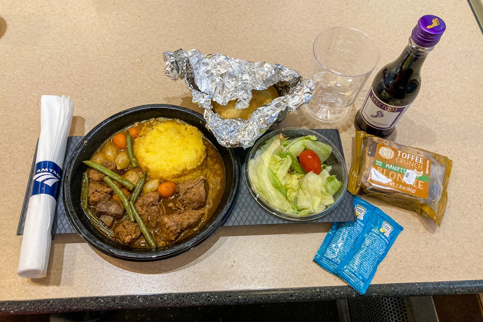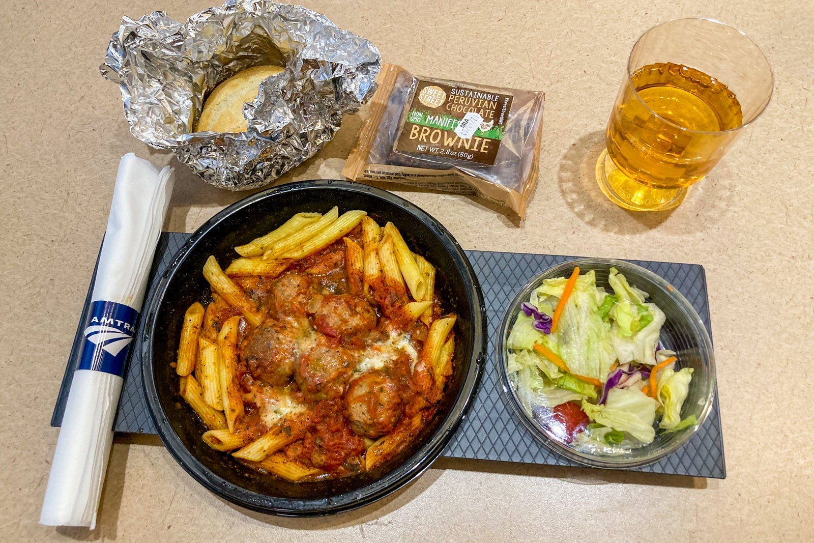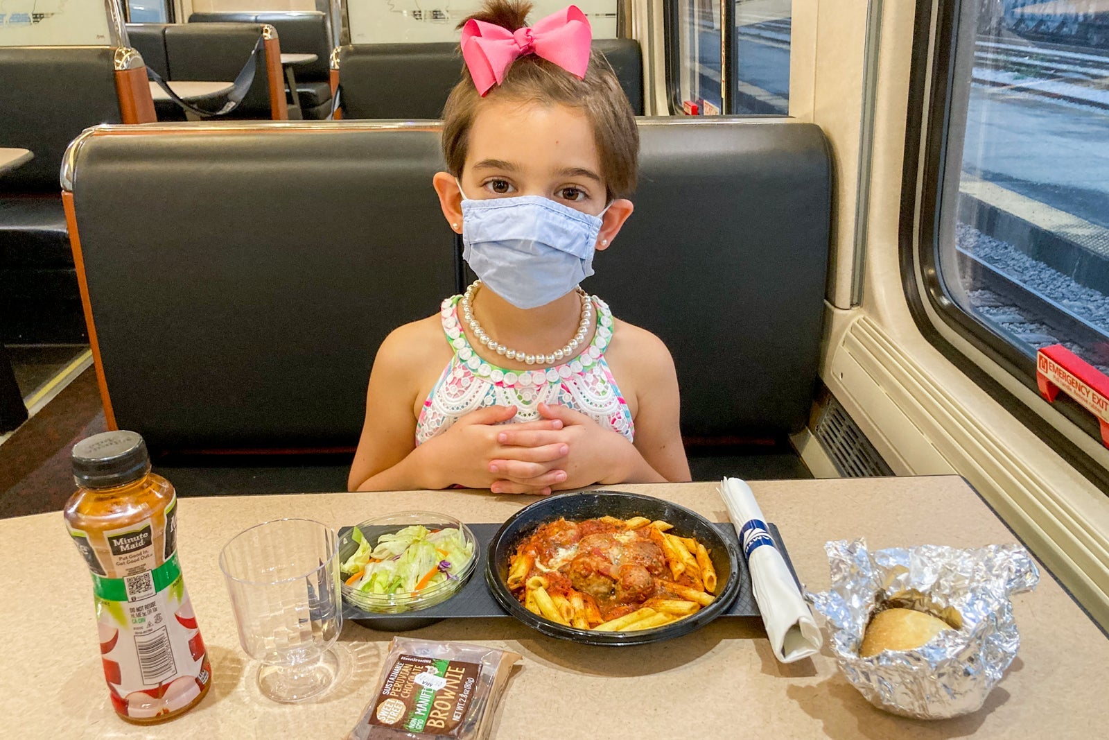 When you purchase a roomette, your meals are included — so given our travel times, we enjoyed complimentary dinner, breakfast and lunch. That said, Amtrak has added flexibility into its dining options during the pandemic, so we were given the choice of taking our meals in the dining car (which was adjacent to our sleeper car) or having it delivered to our room.