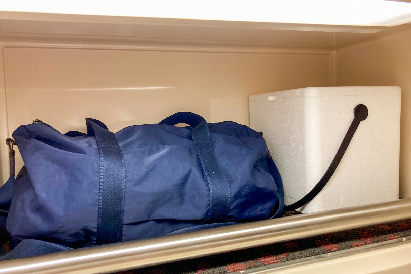 As noted previously, there were a surprising number of spots to stow our carry-on items — including under the seats. There was also a small net pocket toward the ceiling that would hold a phone or other small items from the occupant in the top bunk. However, the most ingenious spot was in the top-right corner of the room, which easily held our overnight bag plus a small cooler (we brought some Florida treats for a friend in D.C.).