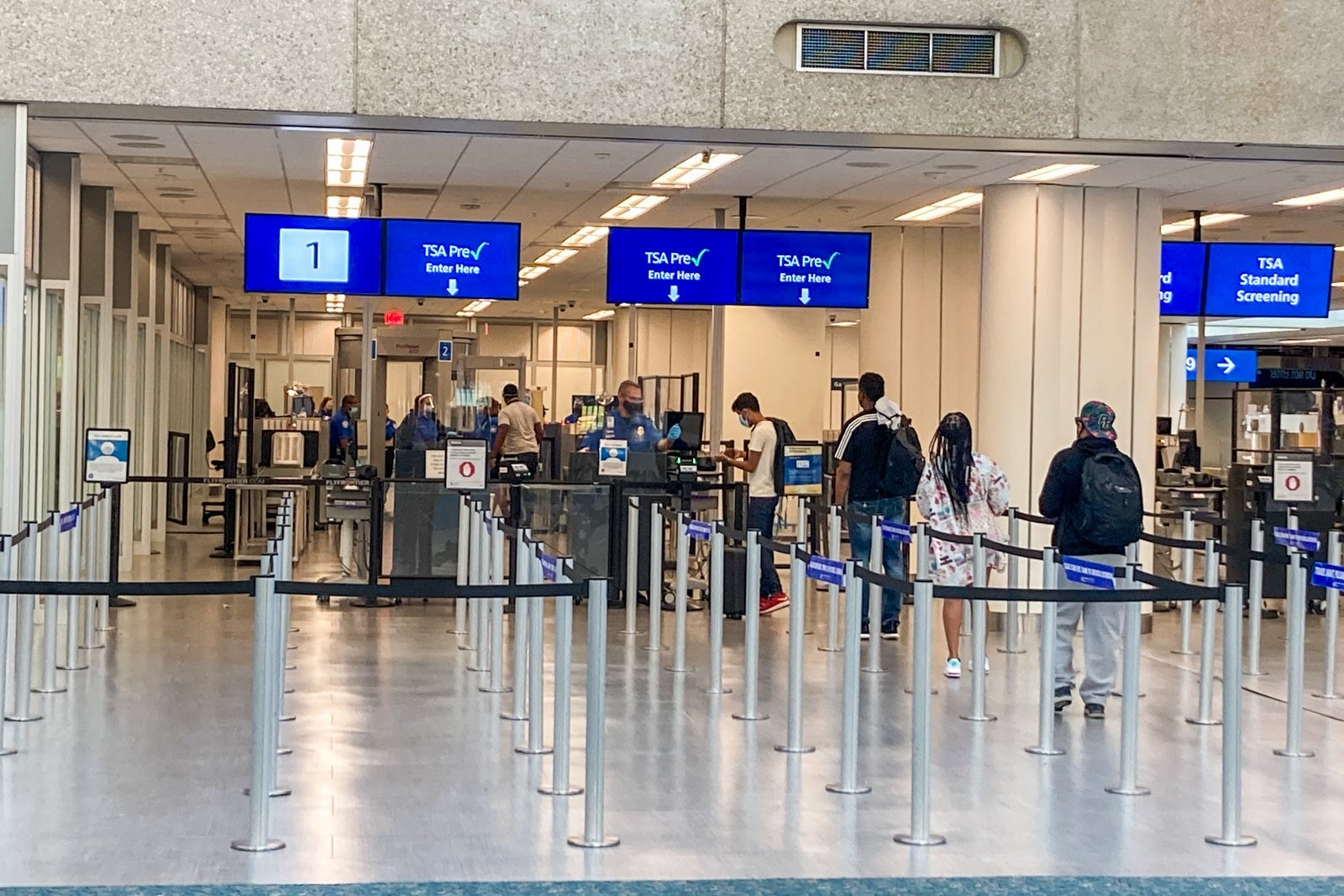 My wife parked in an off-airport lot (with a loyalty program ... naturally), and she arrived at the airport after a short shuttle ride. She skipped the check-in desk, as she already had her boarding pass and wasn't checking a bag. The regular security checkpoint for gates 1–59 indicated a wait of 12–16 minutes — but thankfully, her Global Entry membership includes TSA PreCheck. There was no wait there, so she was airside within minutes.