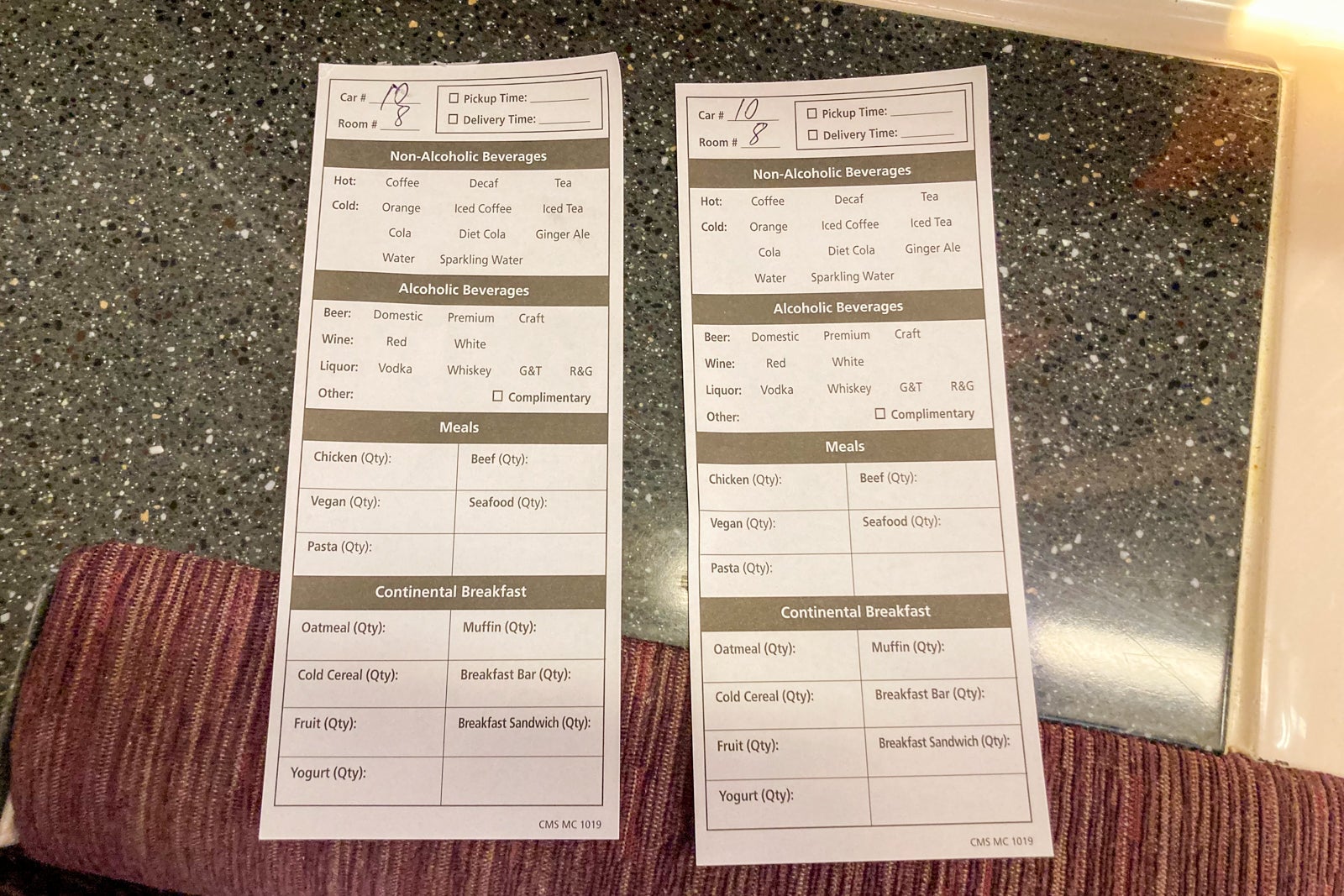 Upon boarding, the sleeper car attendant came by and gave us dinner and lunch slips to use when ordering (we didn't need one for breakfast).