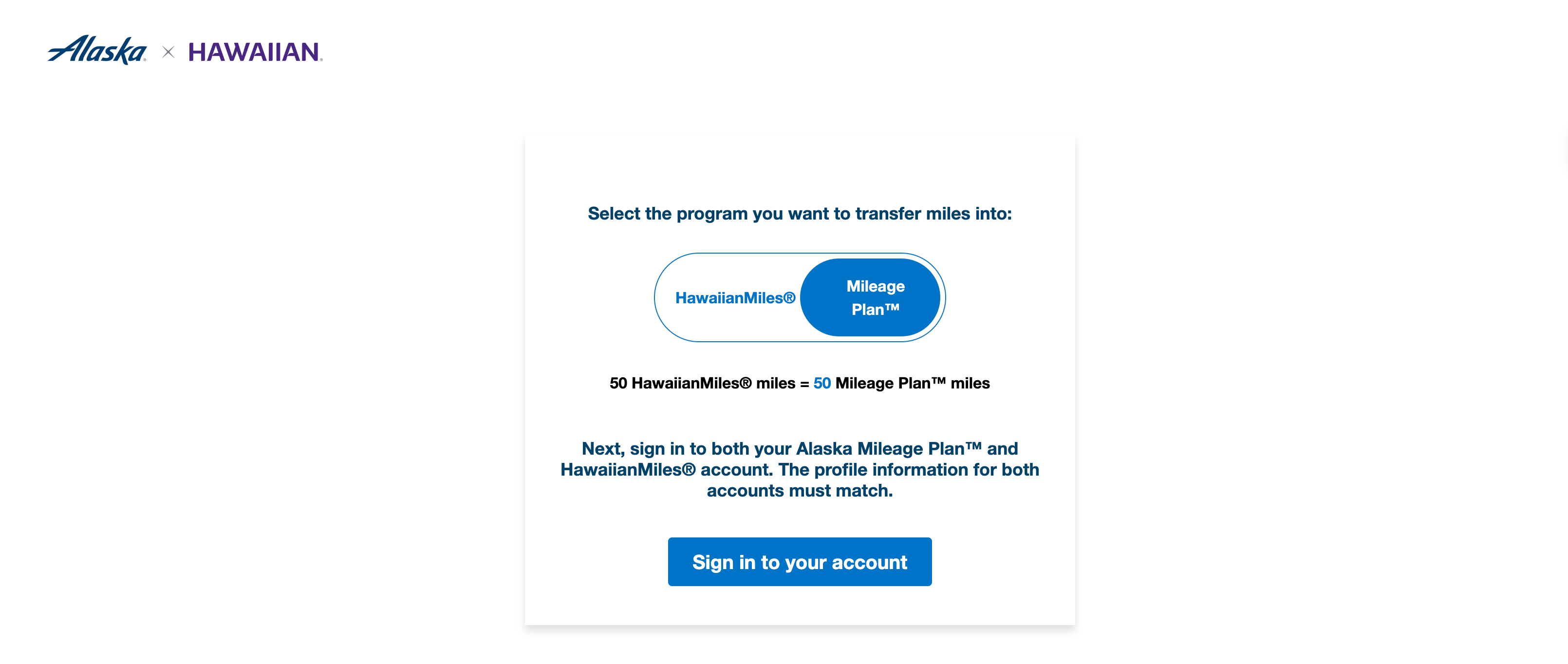Selecting the number of miles to transfer from Hawaiian to Alaska