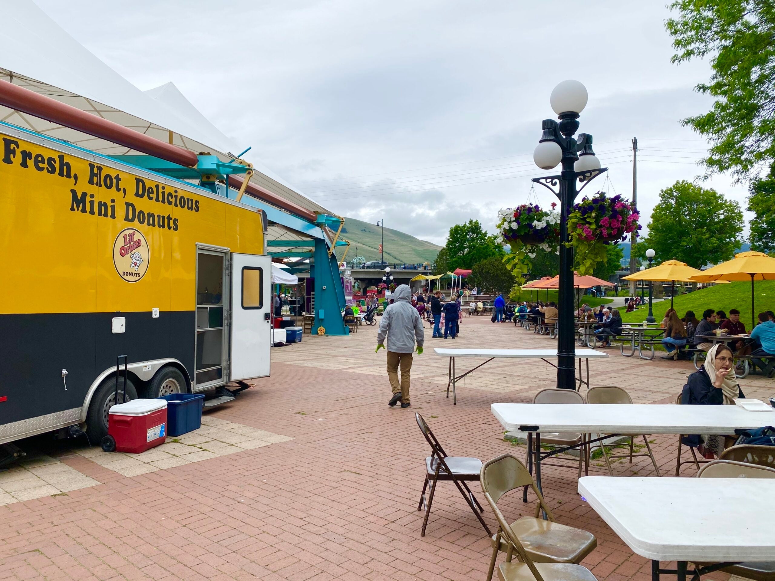 Luck was really on our side, and we happened to be going through around lunchtime on a Wednesday in the summer. This meant that around a dozen food trucks were lined up in Caras Park in downtown Missoula right next to the spectacular Dragon Hollow playground that was our original reason to stop.