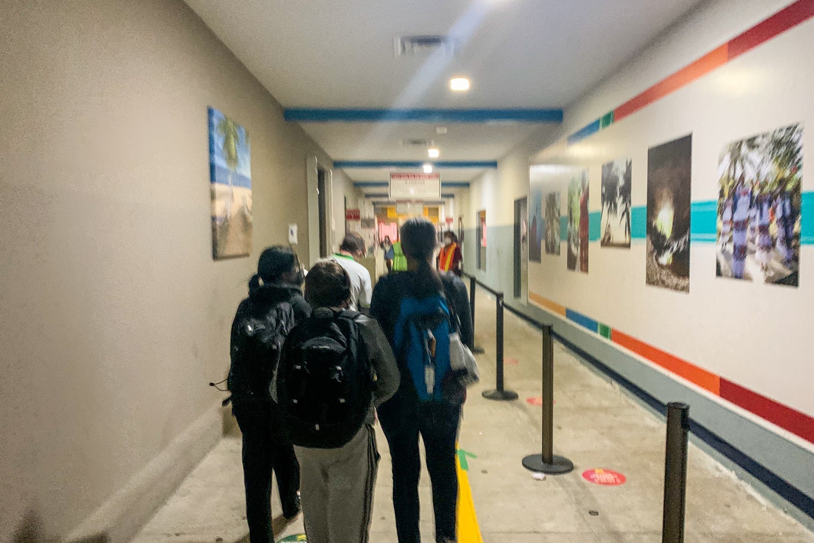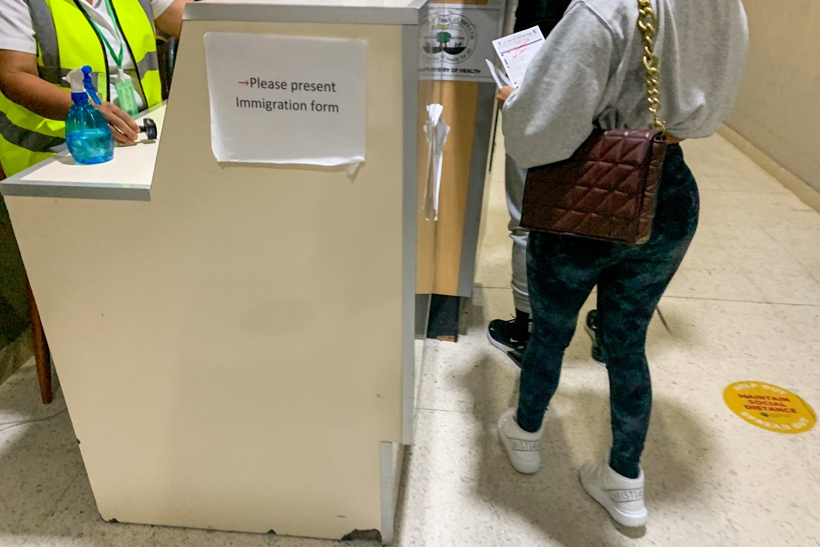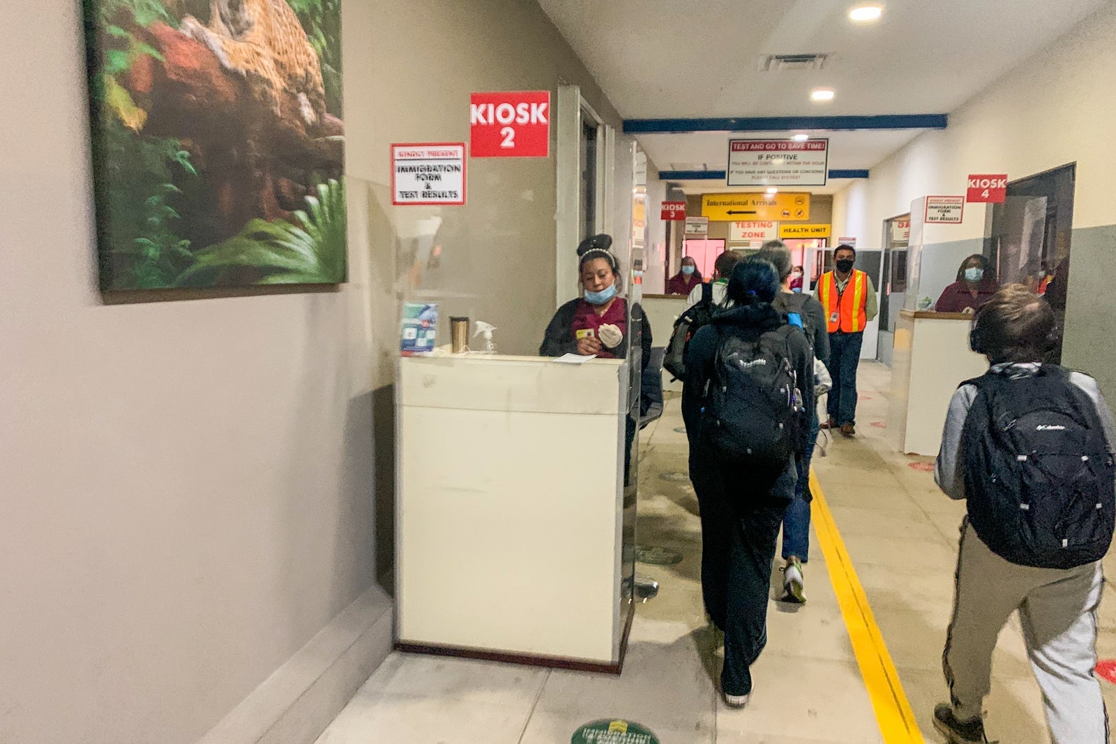 I was directed to a stand with a plexiglass shield where I showed my negative test results from Clarity Labs (stored on my phone as a photo) as well as the immigration form. The form was stamped by a friendly woman working the check-in station, and then I was sent around the corner to the next station where my form was stamped again.