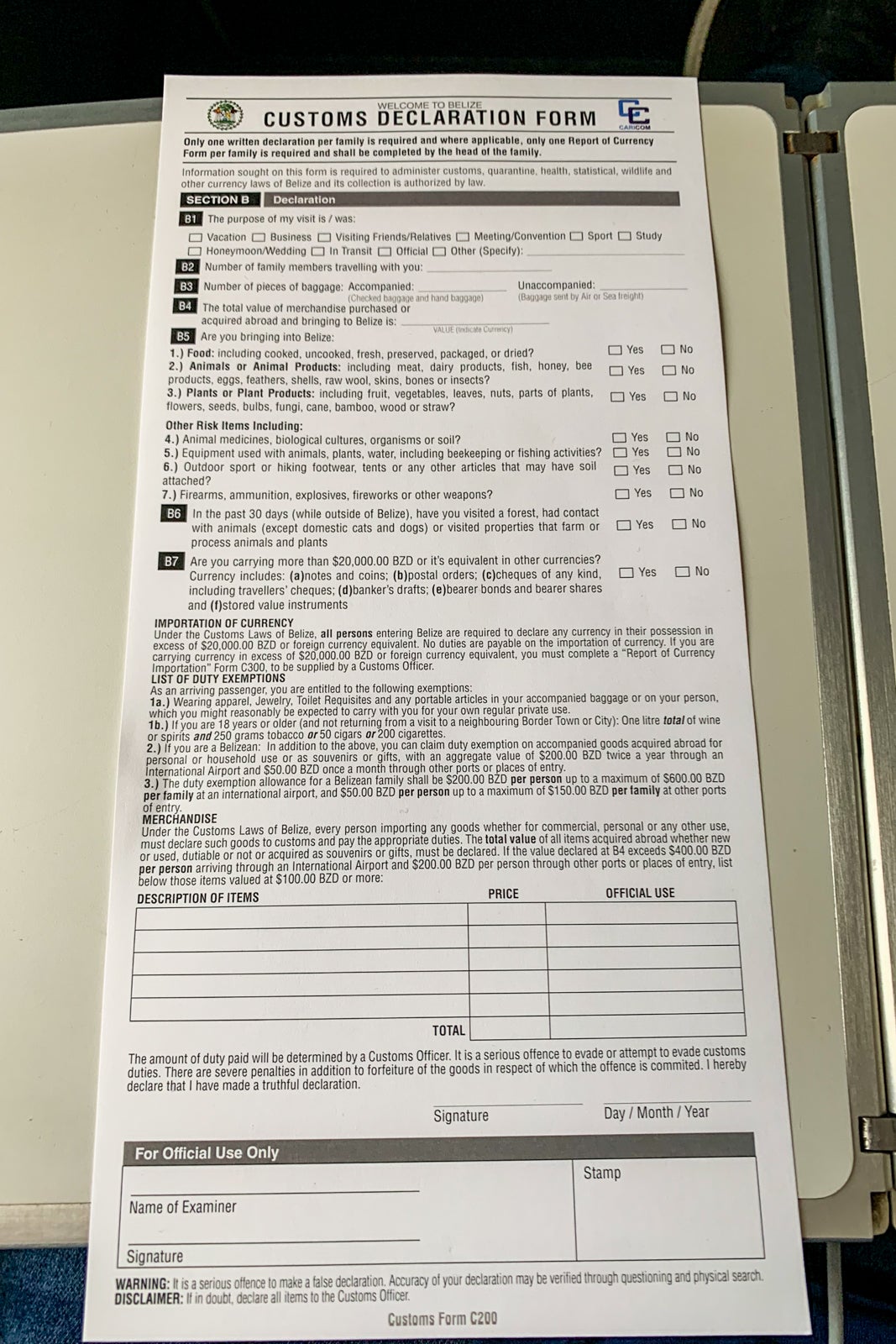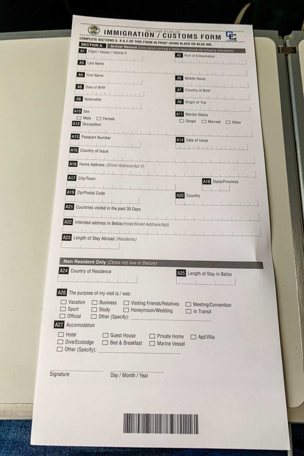 The only thing the flight crew stressed about the arrival into Belize was that every passenger must fill out a two-sided immigration and customs form. One side is for your arrival details and asks for your home address, passport information, residency status, occupation and the countries you've visited in the past 30 days. The other side is a basic customs declaration form. There's no specific mention of COVID-19.