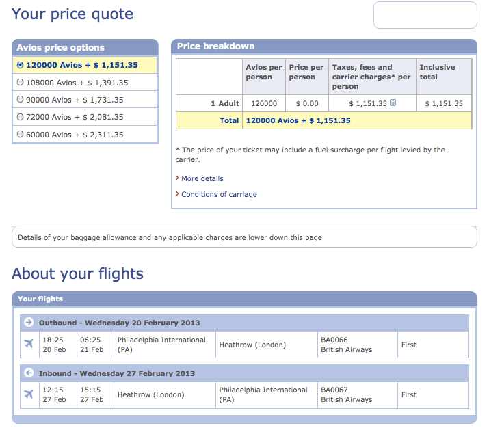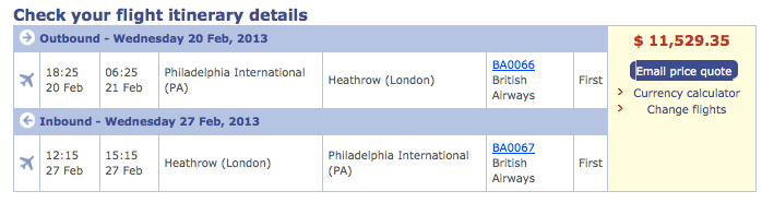 2. "Travel Together" Companion Ticket Redemptions in Business or First Class: One of the main benefits of the Chase British Airways Visa is the "Travel Together" companion ticket. This is an example of a credit card calendar year spending threshold bonus. You earn one of these get when you spend $30,000 within a calendar year. Unlike many other companion tickets, though, the "Travel Together Ticket" works a little differently. Rather than having to buy a full-fare ticket and get the second one for free, you use this one in combination with an award redemption, so you're basically getting two half-price awards. The true value in this lies when you redeem for premium awards like business or first-class seats since British Airways taxes and fees are expensive, so if you were just to use this for coach tickets, you wouldn't be saving that much money. Just to keep in mind, the travel must be solely on British Airways (no Oneworld partners), the cardholder must be on all legs of the exact same itinerary as the companion, itineraries must be roundtrip and originate and end in the US, vouchers are good for 2 years after issue, and only one Travel Together ticket can be earned per card account per year. To see how you can pull value out of this, take the example of a Philadelphia-London round trip in first class next month.