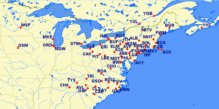 - Airports: Akron/Canton, OH (CAK), Atlantic City, NJ (ACY), Baltimore, MD (BWI), Boston, MA (BOS), Cleveland, OH (CLE), Latrobe, PA (LBE), Niagara Falls, NY (IAG), Newark, NJ (EWR), New York, NY (LGA), Philadelphia, PA (PHL), Chicago (ORD)