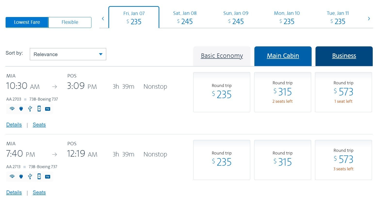 American Airlines offers nonstop flights from Miami (MIA) to POS. In January, you'll find round-trip fares for basic economy at $235, main cabin seats for $315 or 20,000 points ($62.07) and business class seats for $573 or 60,000 points ($62.07).