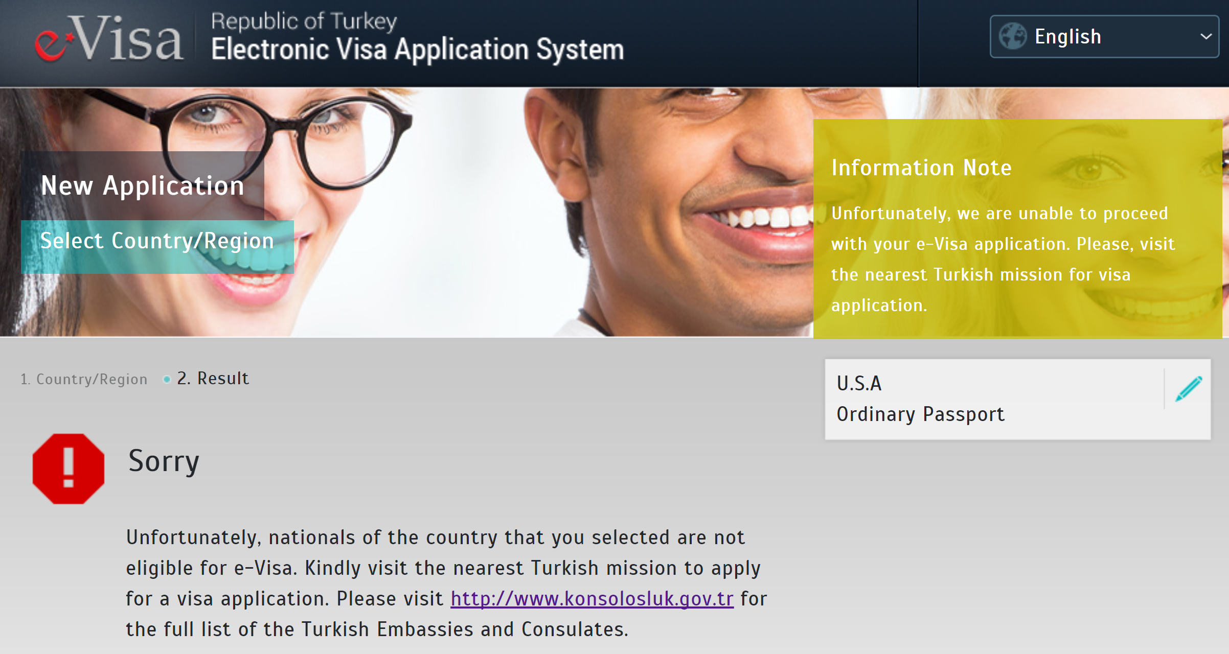 Turkey introduced an e-visa application process in 2013. This saved travelers from waiting in long lines and handing over $30 for a visa upon arrival. However, immediately after the suspension of visa services on October 8, the system blocked US passport holders from obtaining an e-visa from this system. And that's still how it stands: