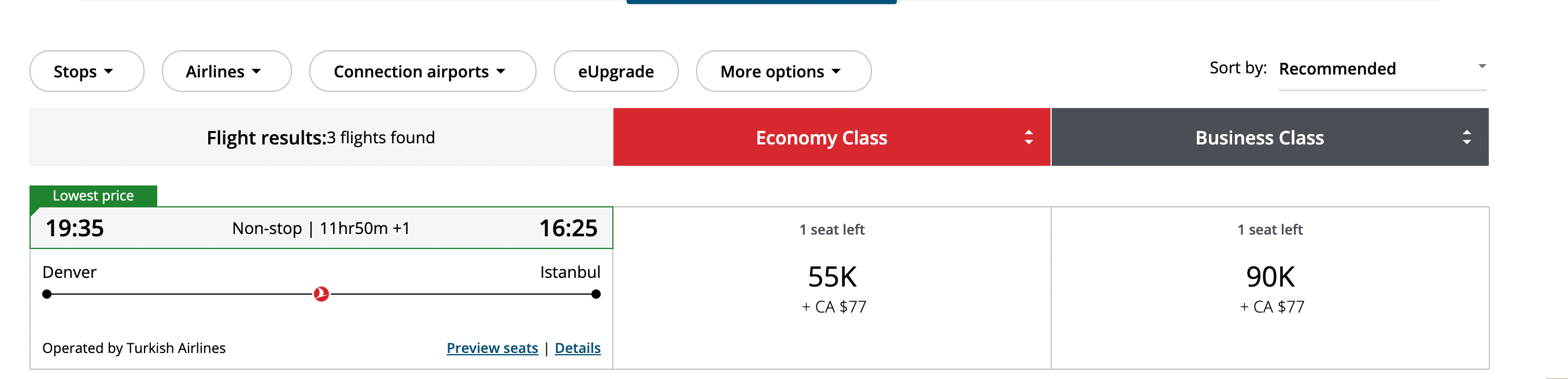 However, when searching for nonstop flights on Turkish Airlines when booking through Aeroplan, there was limited availability compared to United. Therefore, you may have to be flexible on your travel days if you want to book this route in particular.