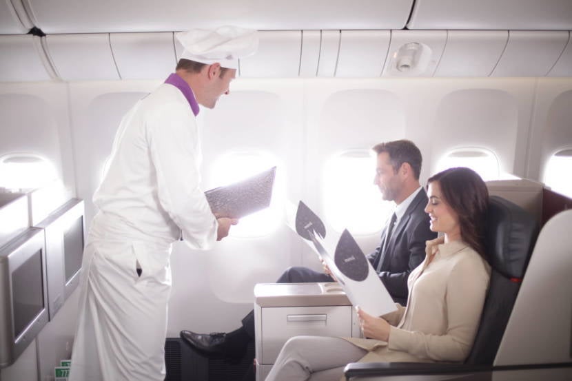 After takeoff, when passengers are unbuckling their seat belts and selecting their movies, flight attendants bring around canapés. After that service, they set down silverware, a bread basket and, at the top of the tray table, a candle. Then they refill glasses of Champagne, dim the lights and let passengers enjoy a three-course dinner while enveloped in the soft glow.