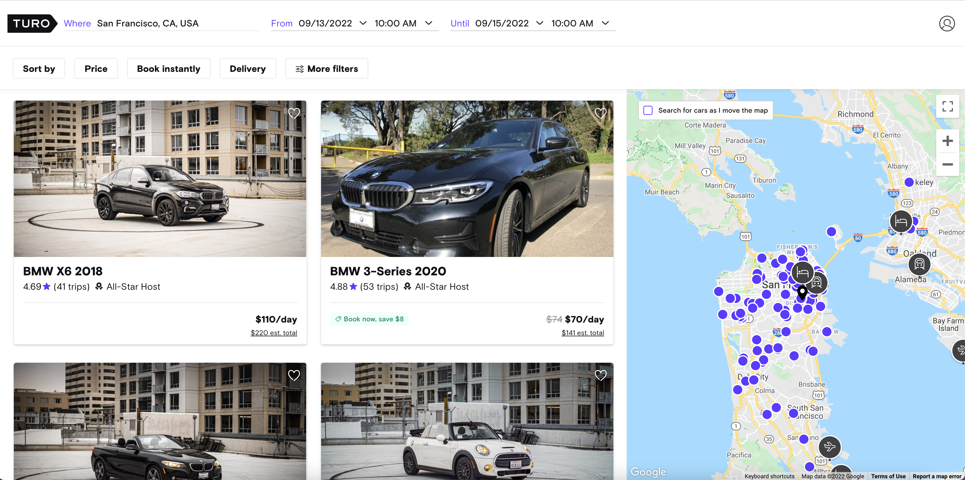 Turo, which recently announced plans to go public, uses a business model similar to Airbnb, where the general public can rent out personal vehicles. TPG has been continually impressed to see the wide variety of cars available to rent with Turo (yes, there are lots of Teslas), which range from basic sedans to luxury vehicles.