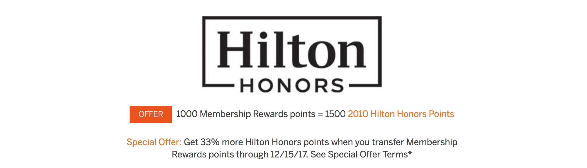 In addition to the above promo, American Express is targeting members to get a 33% bonus when you transfer Amex Membership Rewards points to Hilton Honors. If you're targeted for the offer, you'll get 2,100 Hilton points for every 1,000 Amex points transferred through December 15, 2017.