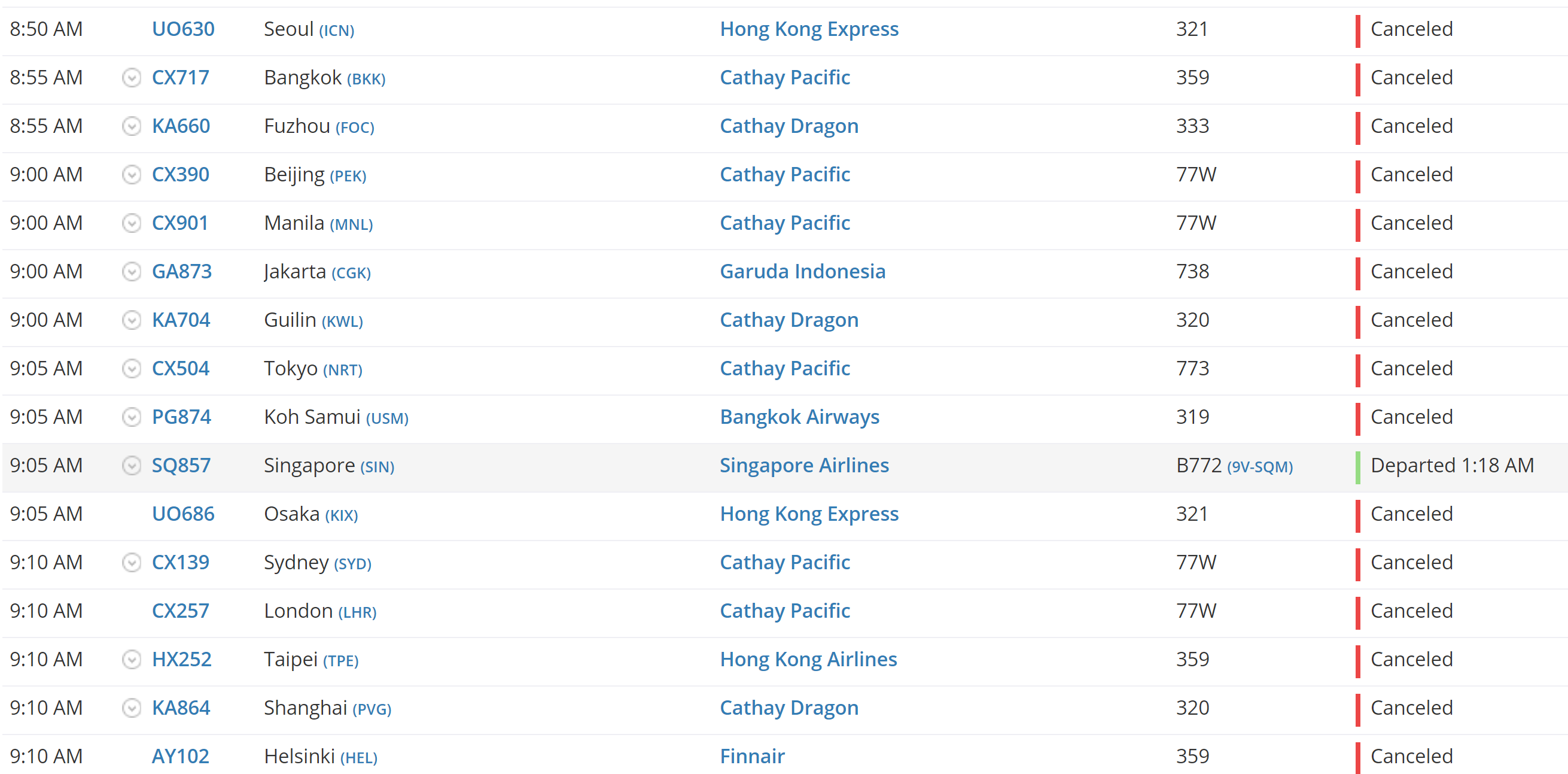 Combined, the three airports have at least 1,130 flight cancellations for Sunday according to FlightAware's flight cancellation tracker. However, this is likely understated as FlightAware only shows 30% of HKG's departing flights and 16% of its arriving flights being cancelled. FlightRadar24 shows that there has been just one commercial flight departure — a Singapore Airlines 777 that departed at 8:00am — from 3:46am through 7:00pm local time.