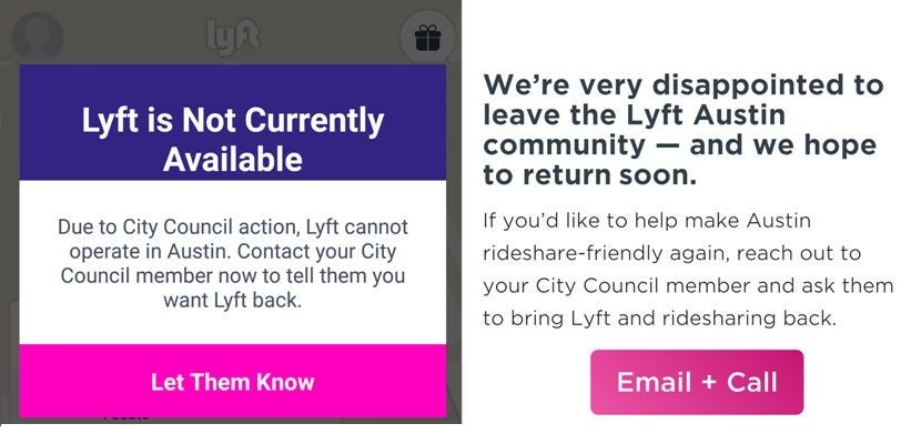 Both companies cite the Austin City Council actions in their decision. Lyft says that it "cannot operate in Austin" while Uber states "we simply cannot operate under the City's new rules."