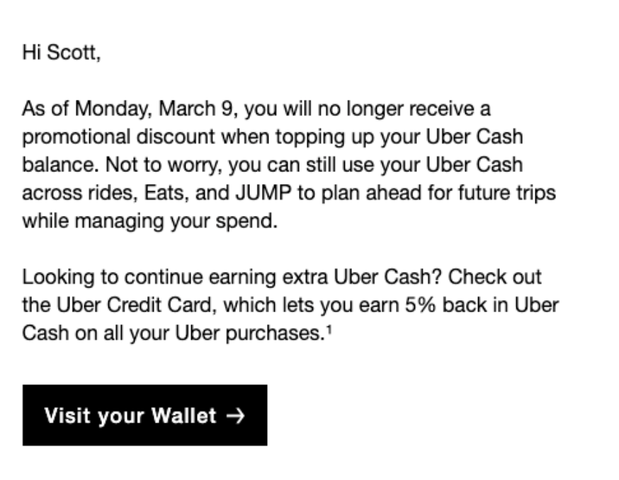 Uber just announced that it is removing the promotional discount that customers receive when topping off their Uber Cash account balances.