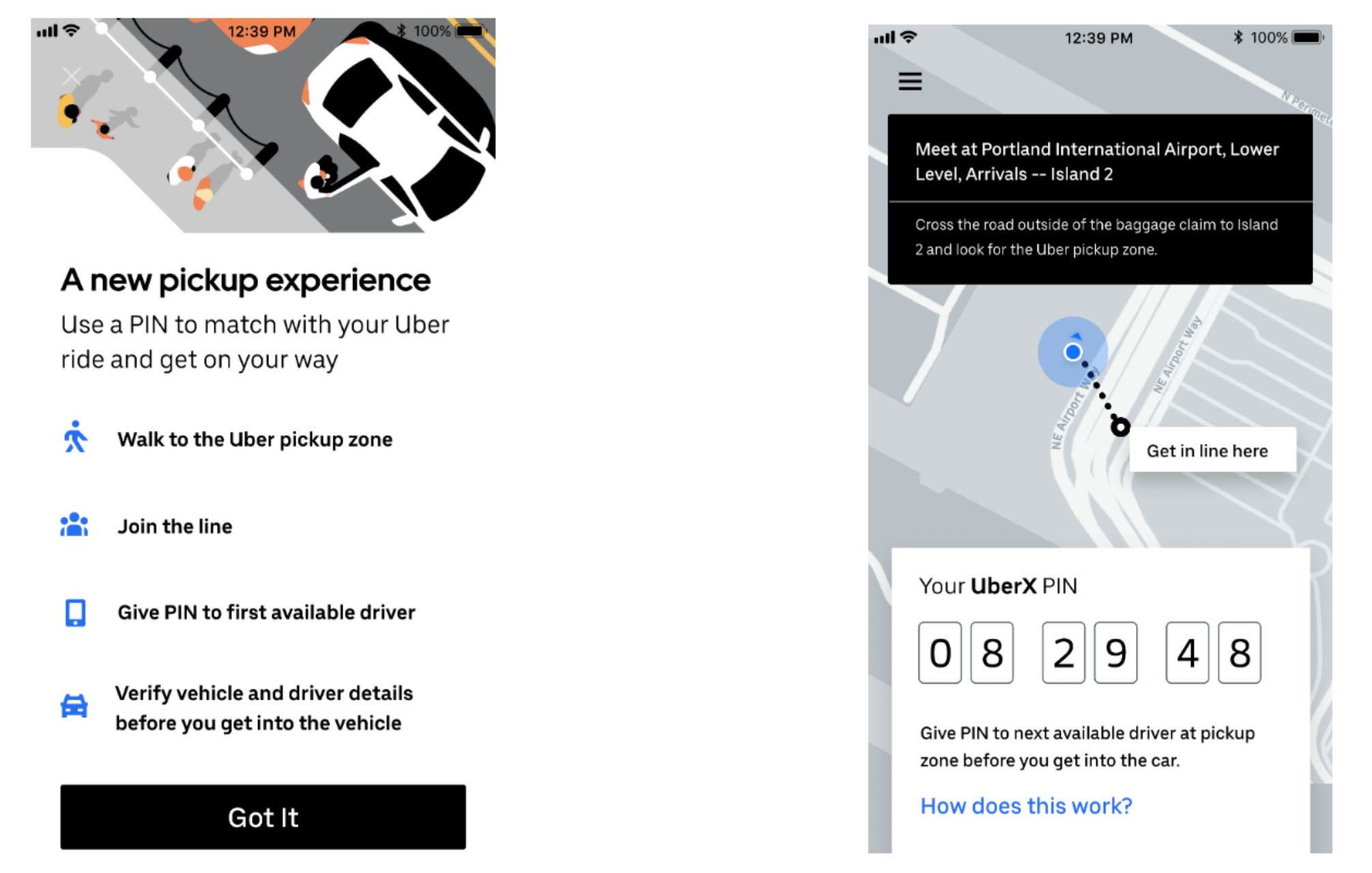 At Portland International Airport riders will input their destinations, request a ride, and then be instructed to head out to the designated pickup zone. All riders will receive a six-digit personal identification pin. Once the rider arrives at the pickup area, they will join other riders in line. When they're at the front of the queue they'll hop in the next available Uber and share their code with their driver. Once the PIN has been entered into the driver app, the rider's info will populate and the trip will begin.