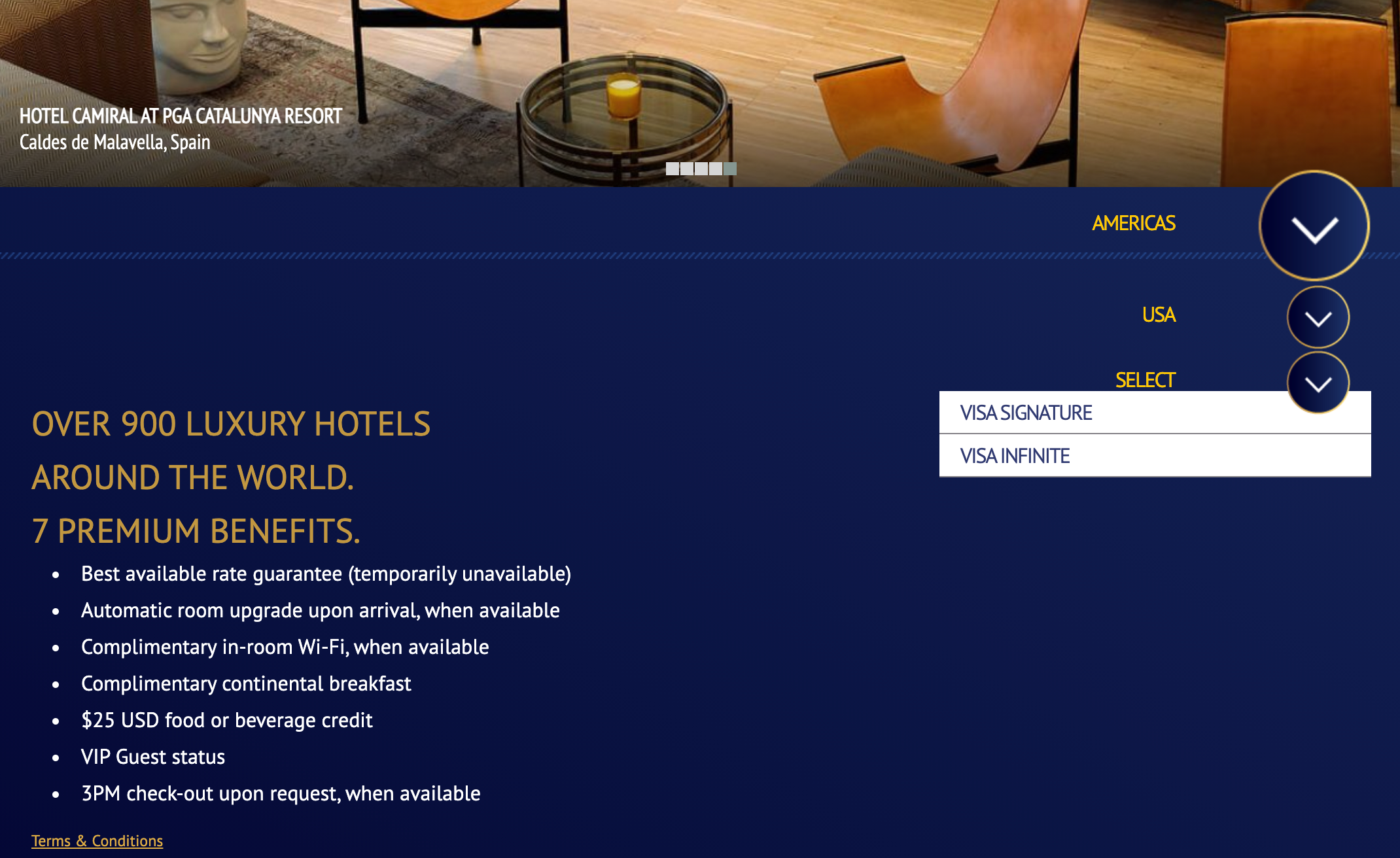 The Visa Luxury Hotel Collection is a service that grants you elite status-type benefits just for booking through its site. It's meant exclusively for Visa Signature and Visa Infinite cardholders. Examples of Visa Signature cards are: