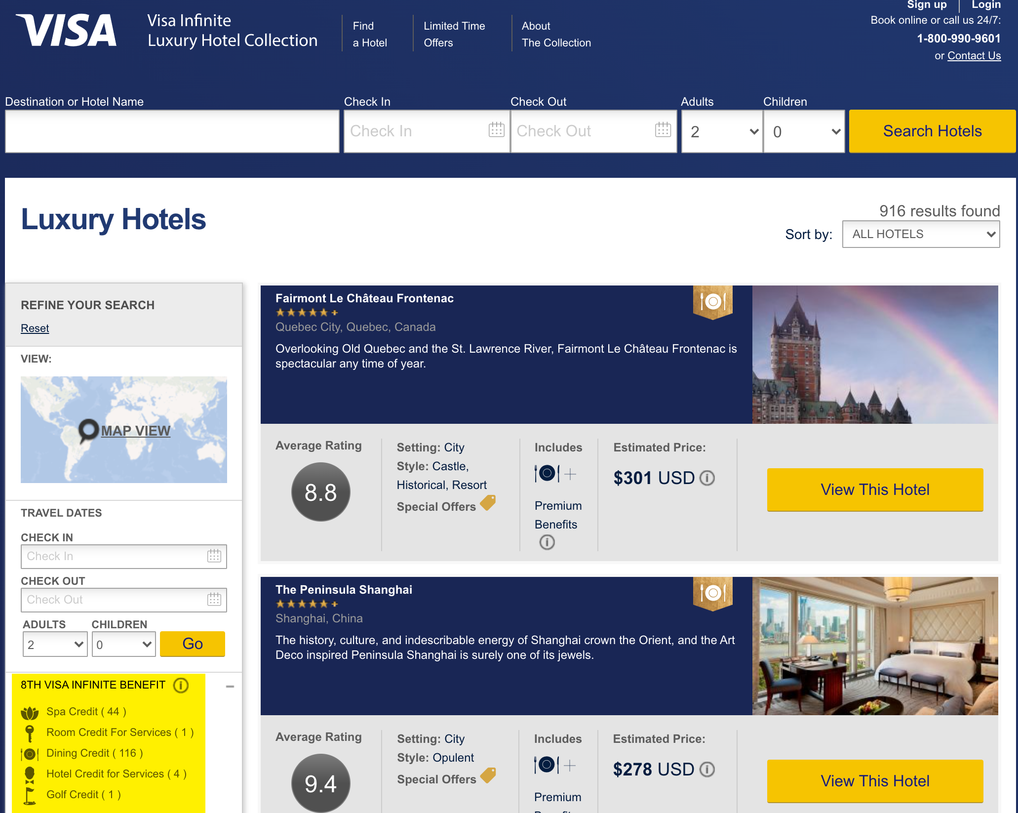 This is very similar to what you'll find on the lauded Amex Fine Hotels + Resorts portal. However, there are only 200 properties that participate in these extra Visa Luxury Collection benefits. Amex Fine Hotels + Resorts provides 1,100 hotels to choose from.