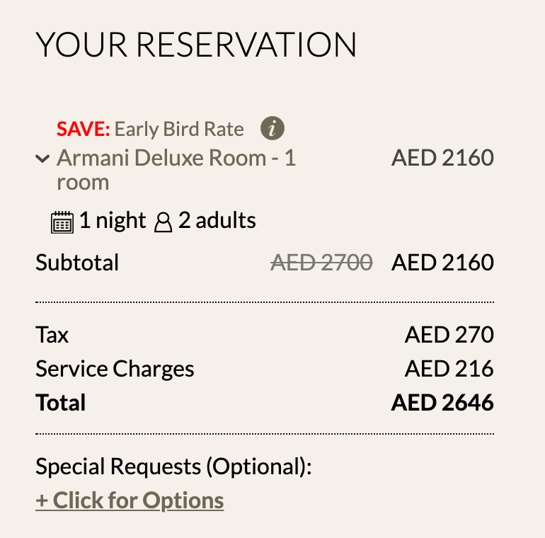 However, a cheaper rate is available, which you'll only find when booking direct: The Early Bird Rate for $720. It's completely nonrefundable, so you'd better know for absolute certain that you can make the trip if you book this price. You'll save 662 AED ($180) per night.