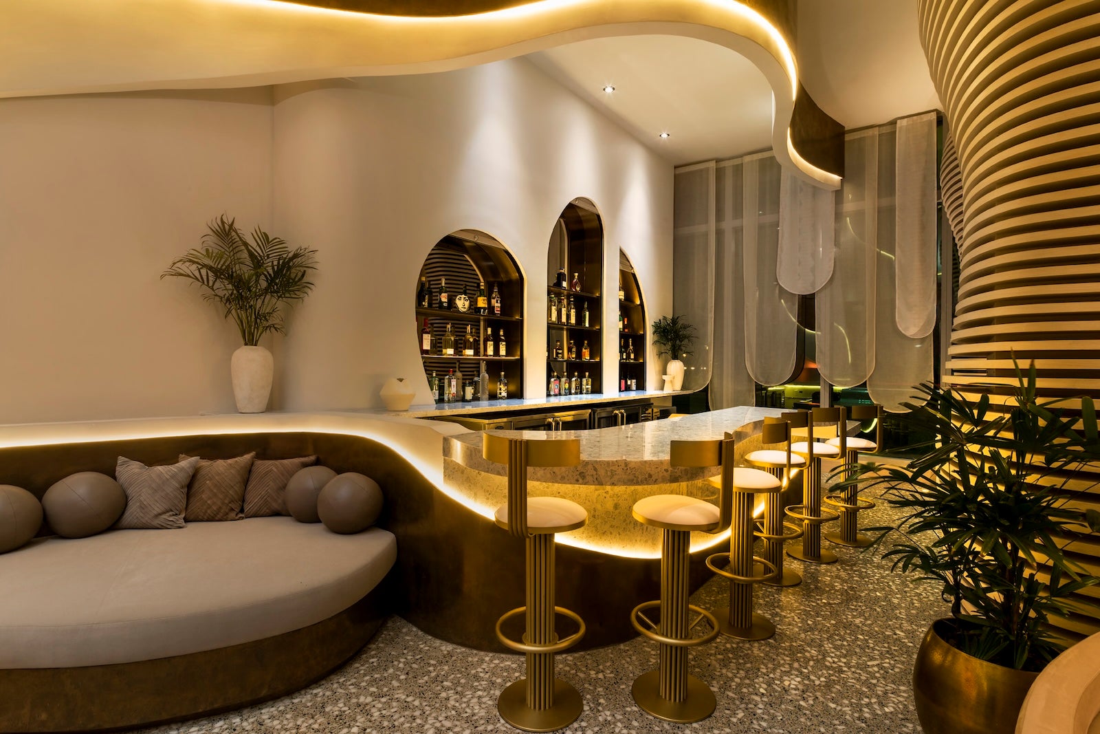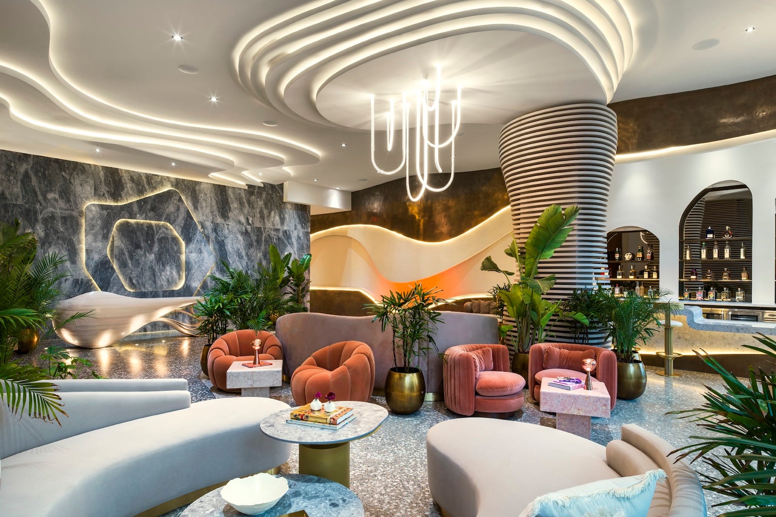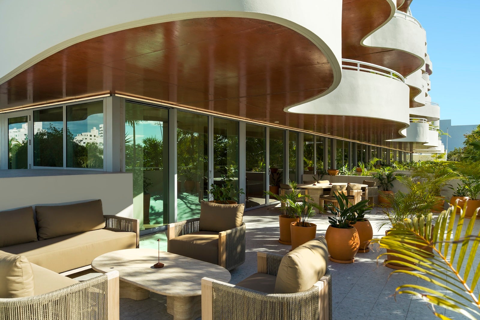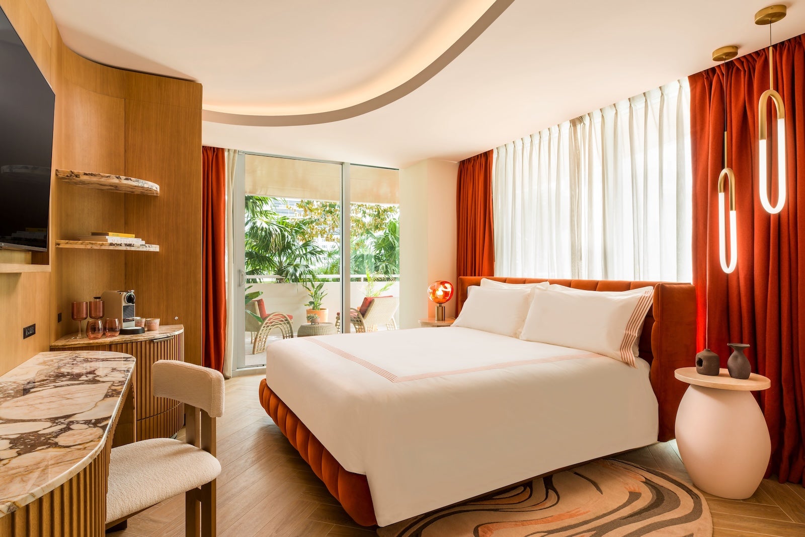 Designed by French architect Rudy Ricciotti, the hotel's Washington Avenue exterior features white, fluid curves designed to pay homage to "the sensuality of the French Riviera," according to a statement from the hotel. Inside, Gulla Jónsdóttir-designed interiors celebrate "the vitality of Miami Beach" through tropical modernism and South American flair.