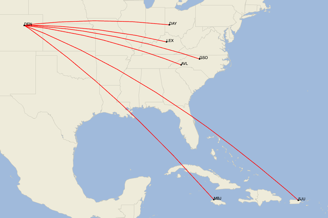 United claims that four cities (Dayton, Greensboro, Lexington and San Juan) are all new nonstops from Denver, but Cirium schedules show that Dayton is actually a market United suspended in April 2020. Additionally, Frontier used to fly between Denver and Greensboro until August 2018. The other two markets are indeed new for Denver.