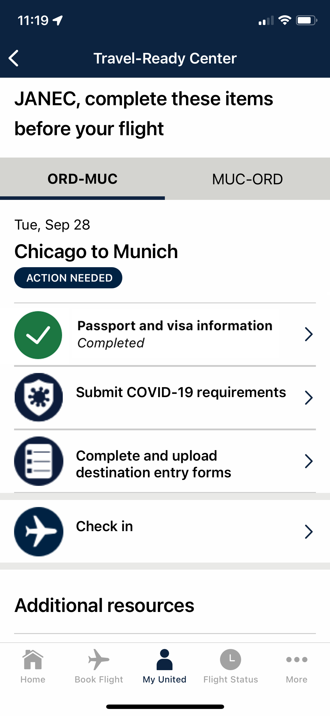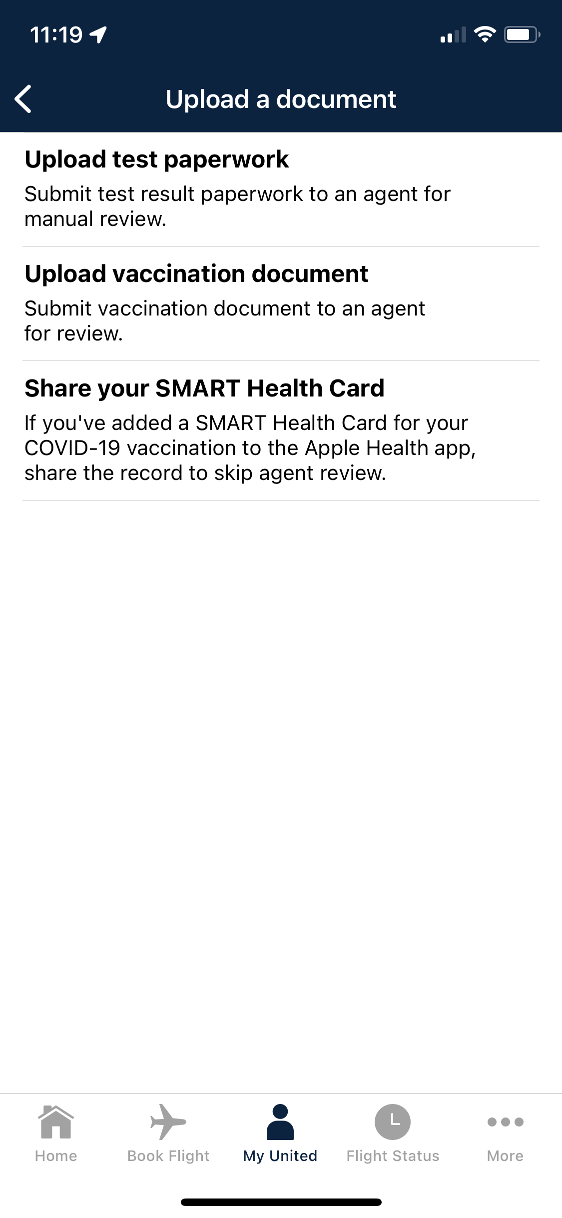 When you have an upcoming flight to a destination that requires proof of vaccination, United's Travel-Ready Center will prompt you to upload your certificate before check-in opens. You'll still have the option to upload a picture of your paper-based card, but using the Apple Health method will be your best bet.