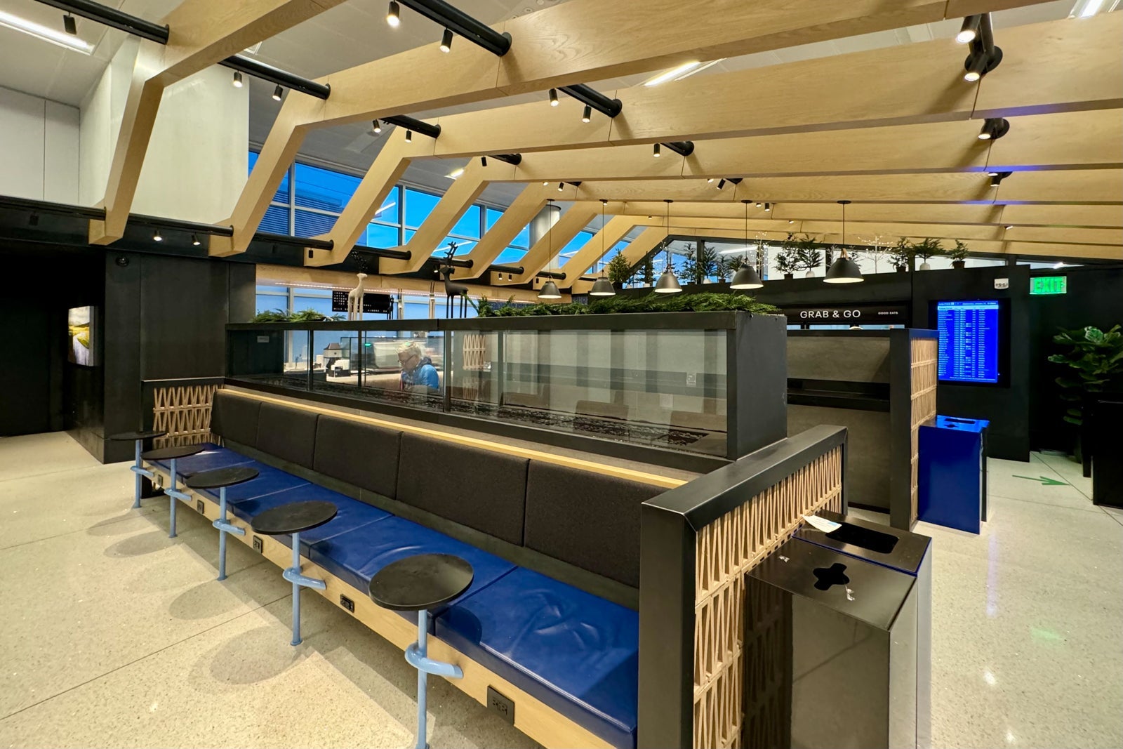 Instead, there's a coffee bar staffed with baristas and a bunch of fridges and beverage stations stocked with snacks and sandwiches for flyers to quickly grab before their next flight.