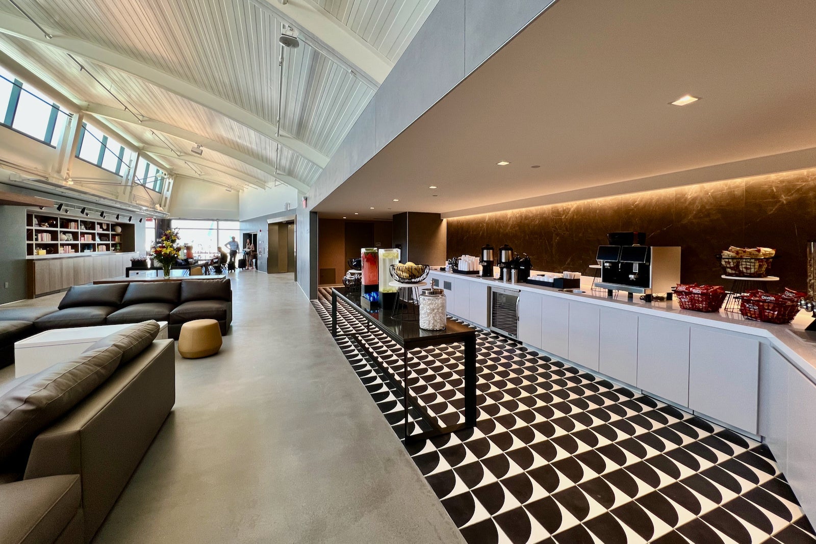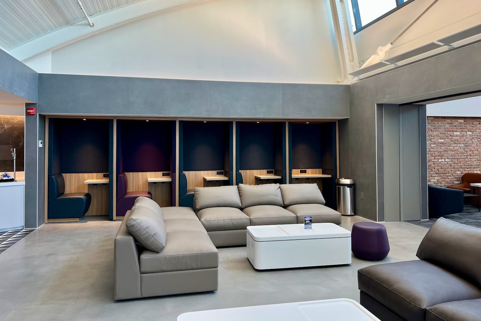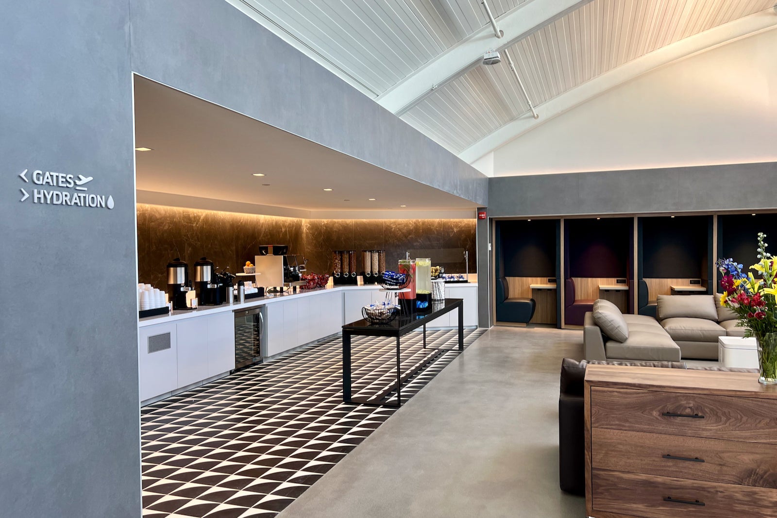 There’s a “hydration station,” as United calls it, in the corner, which gives way to some private workstation nooks, a variety of couches and a large rectangular sitting area.