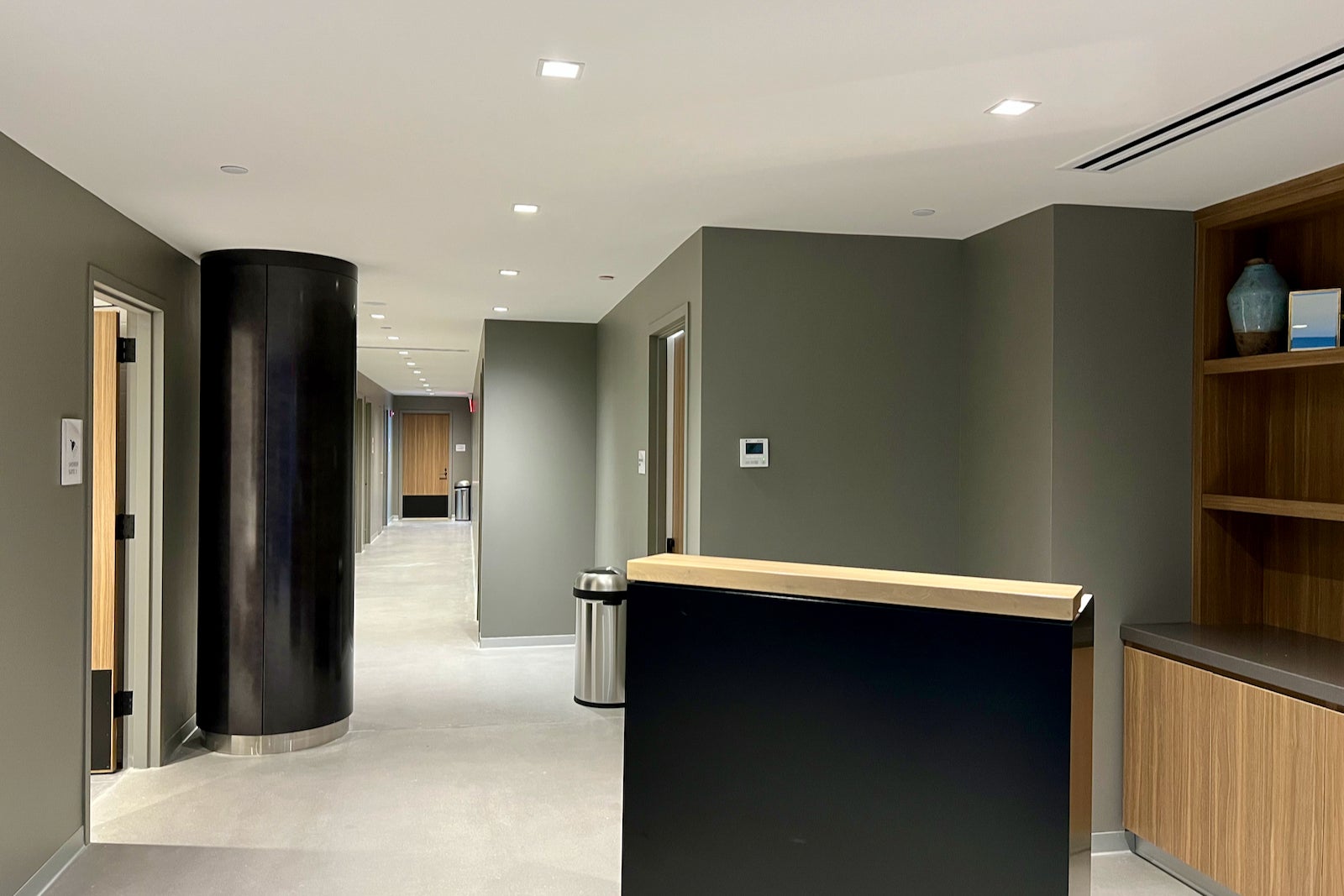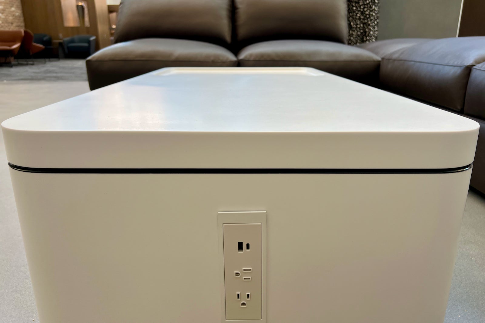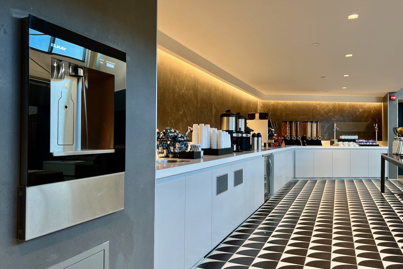 There’s a “hydration station,” as United calls it, in the corner, which gives way to some private workstation nooks, a variety of couches and a large rectangular sitting area.