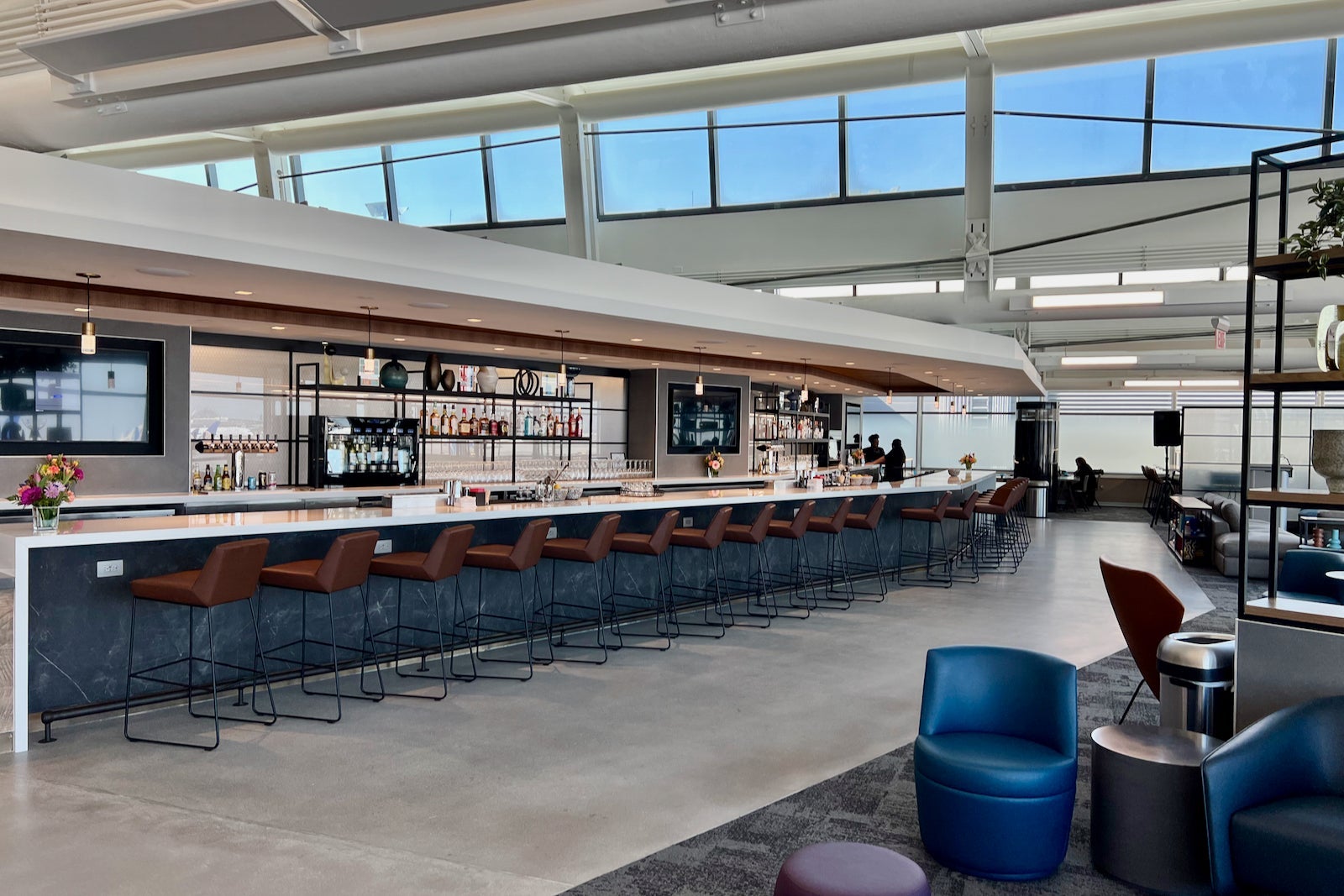 There’s also a fully stocked bar in the center of the lounge, with nearly 25 barstools for those looking to socialize before their flight.
