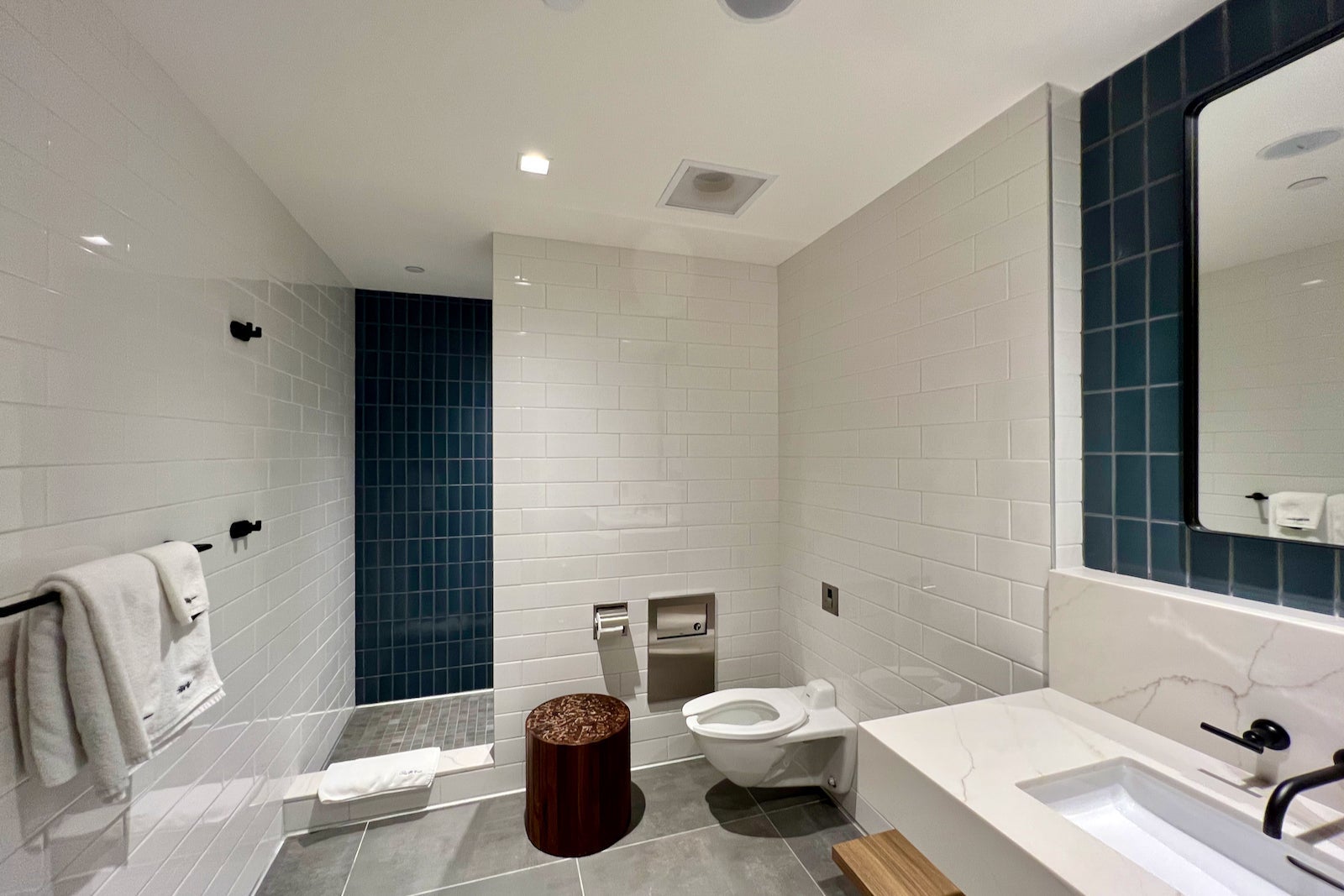 There are six shower suites in the Newark club. Each features a walk-in shower, toilet and vanity area. The suites are stocked with Sunday Riley amenities and Saks Fifth Avenue-branded towels, the same brands you’d find in the Polaris lounge and onboard the plane in premium cabins.