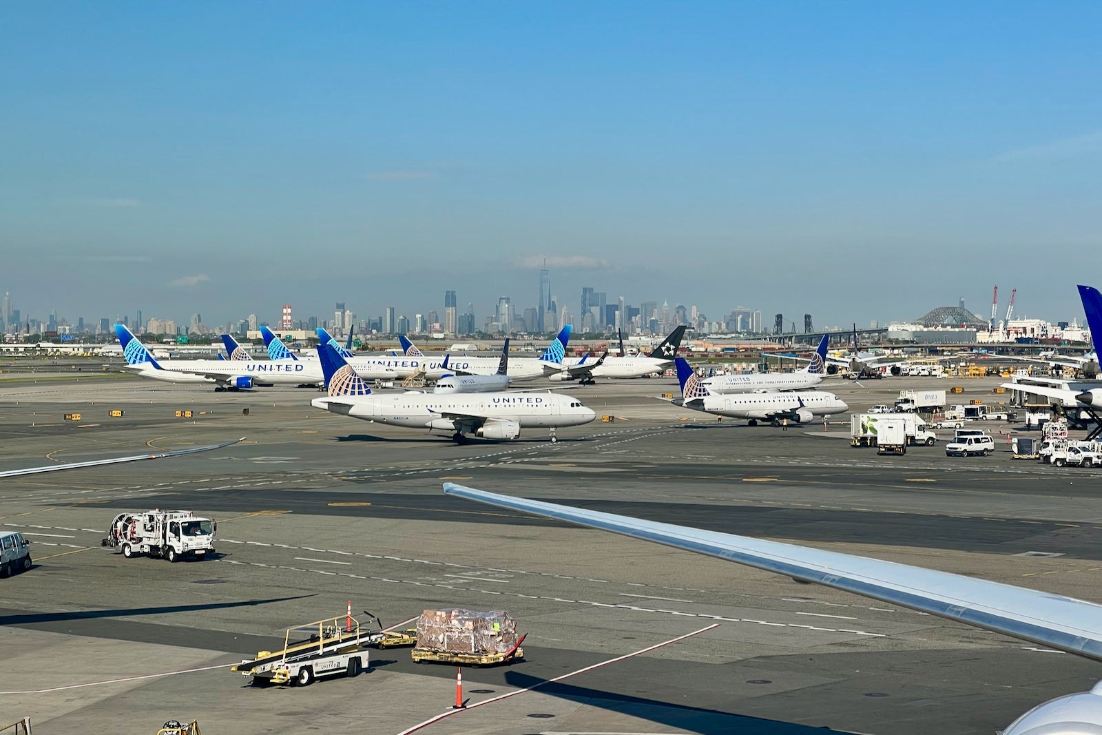 On a clear day, you’ll even catch a glimpse of the lower Manhattan skyline in the distance, with One World Trade Center towering above the mix of United liveries in the foreground.