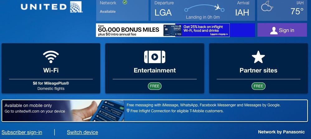 I was expecting United to transition its existing fleet outfitted with Panasonic Wi-Fi to Viasat, but that hasn't happened just yet. Hopefully, this switch is still in the works because the Wi-Fi on the A319 was seriously lagging. It cut out for a good portion of the flight, and when it worked, download and upload speeds hovered at 10Mbps and 5Mbps, respectively.