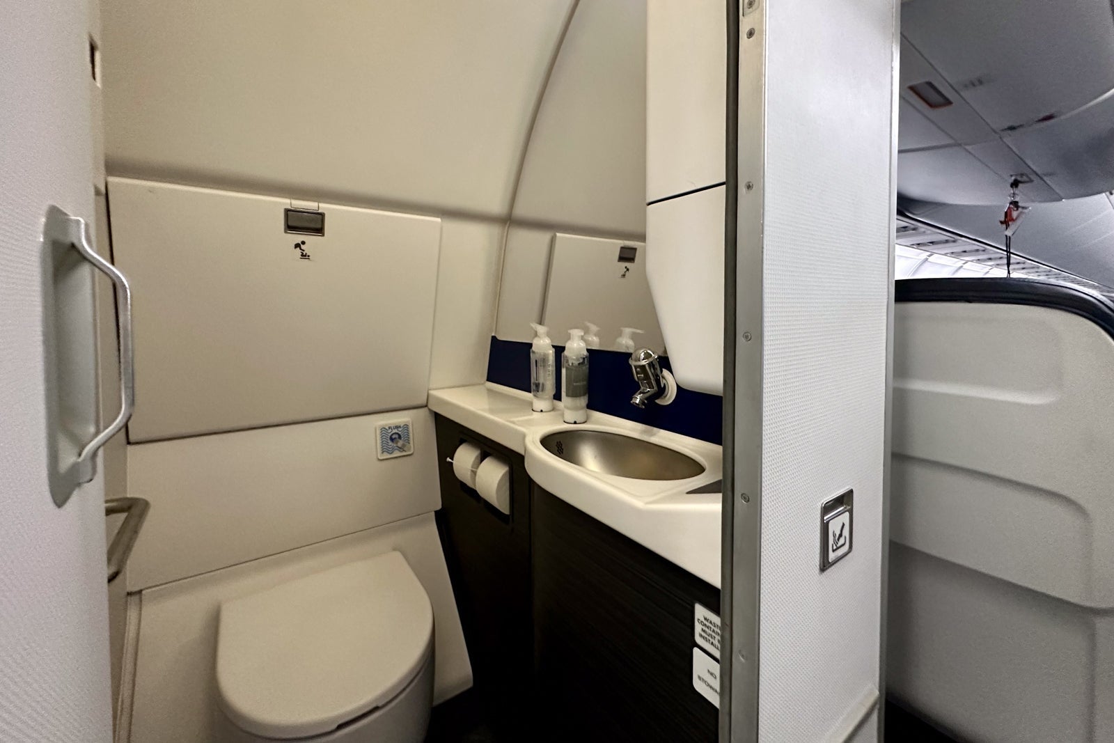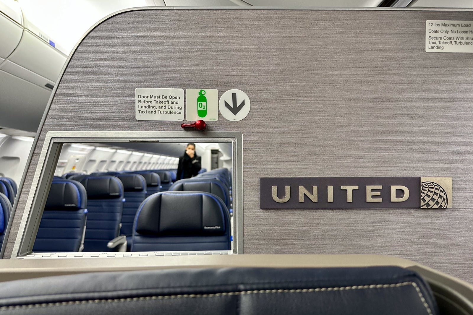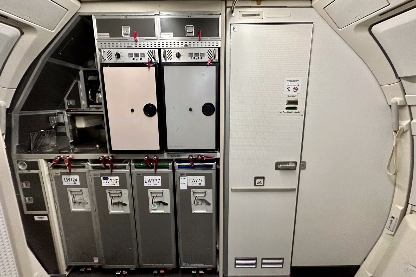 United didn't change the location or size of the lavatories, but it did upgrade them with its latest branding motifs and finishes, including blue and gray wallpaper. (You'll find one lavatory at the front of the plane and two in the back galley.)