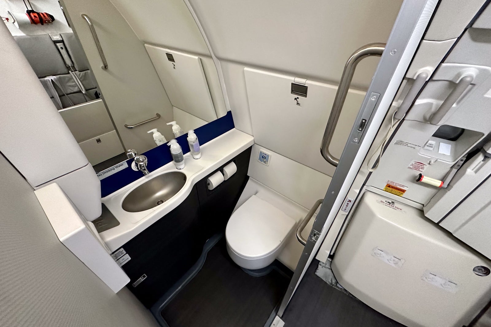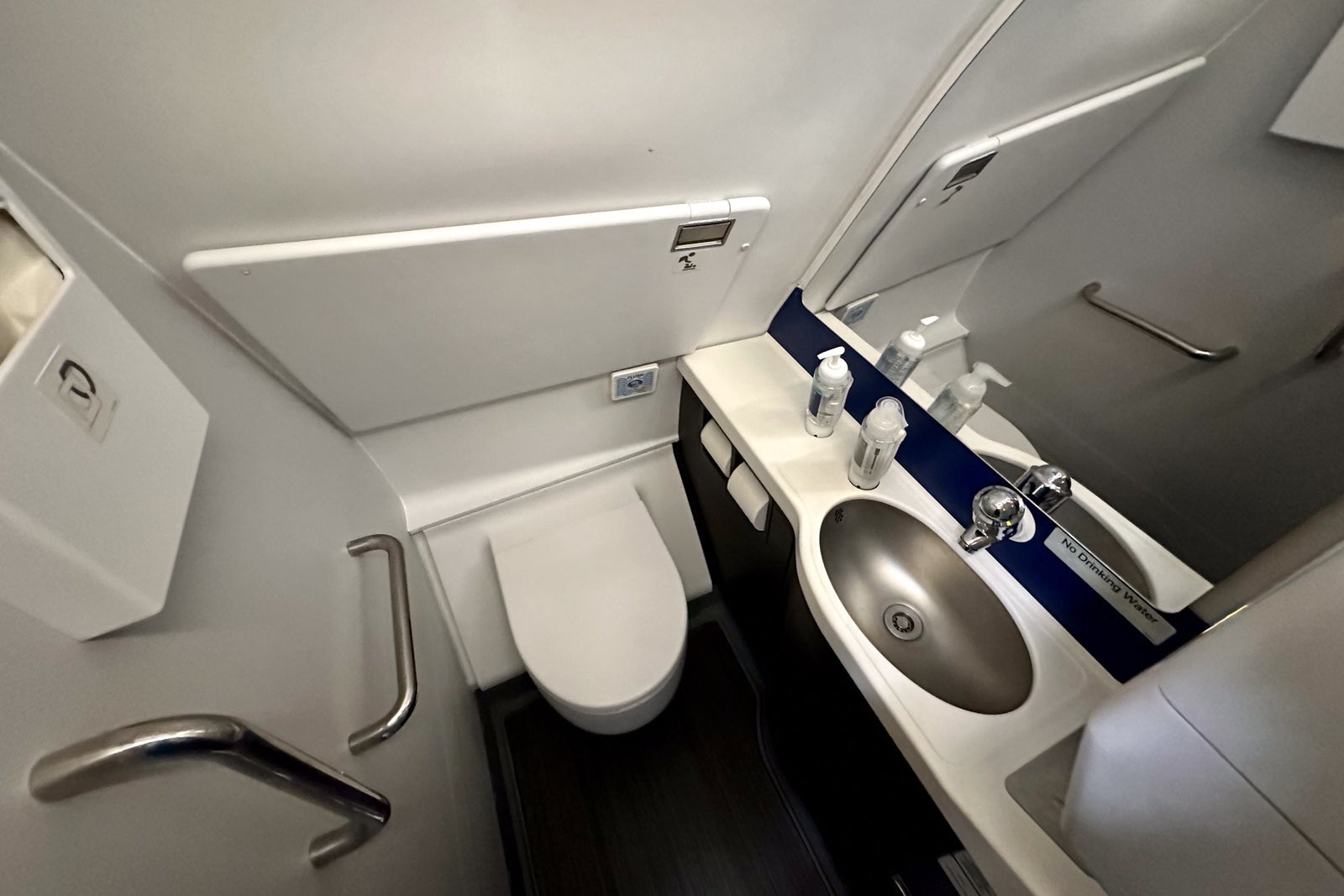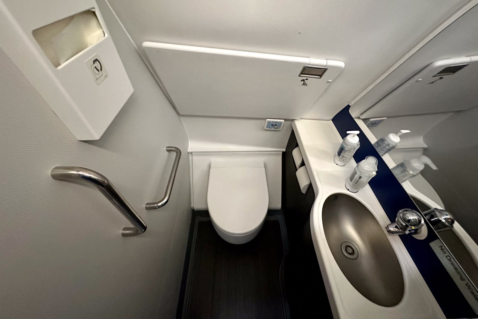 United didn't change the location or size of the lavatories, but it did upgrade them with its latest branding motifs and finishes, including blue and gray wallpaper. (You'll find one lavatory at the front of the plane and two in the back galley.)