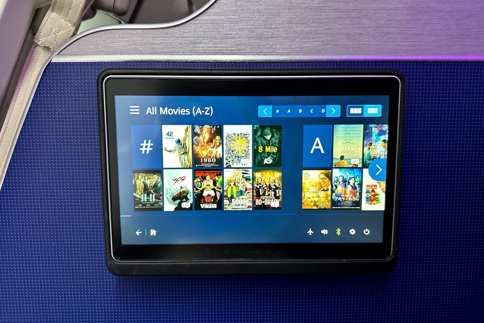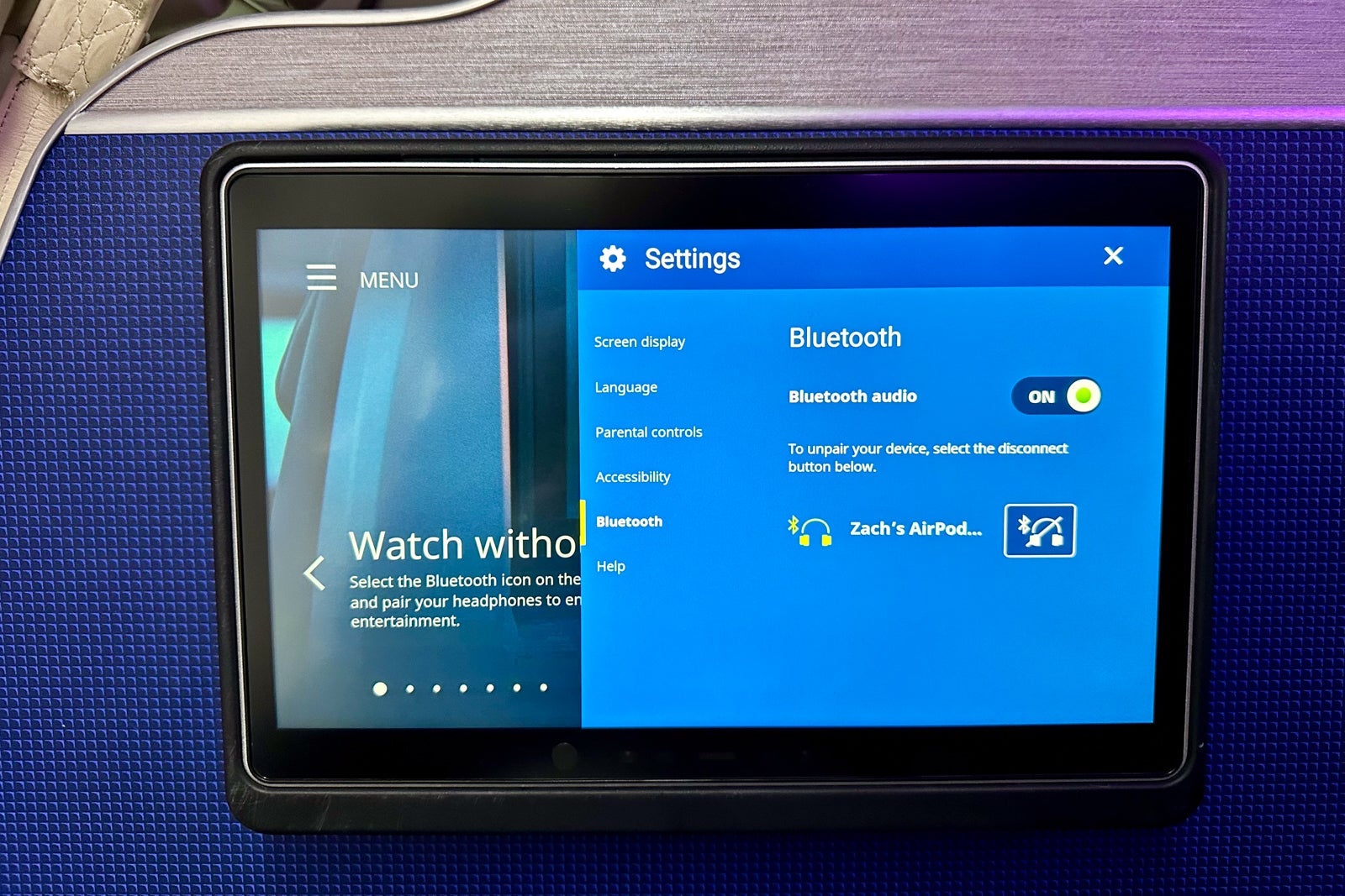 Just like first class, these screens feature built-in Bluetooth to pair your wireless headphones. (Don't worry, there's still a traditional 3.5-millimeter audio jack for those who use wired headphones.)