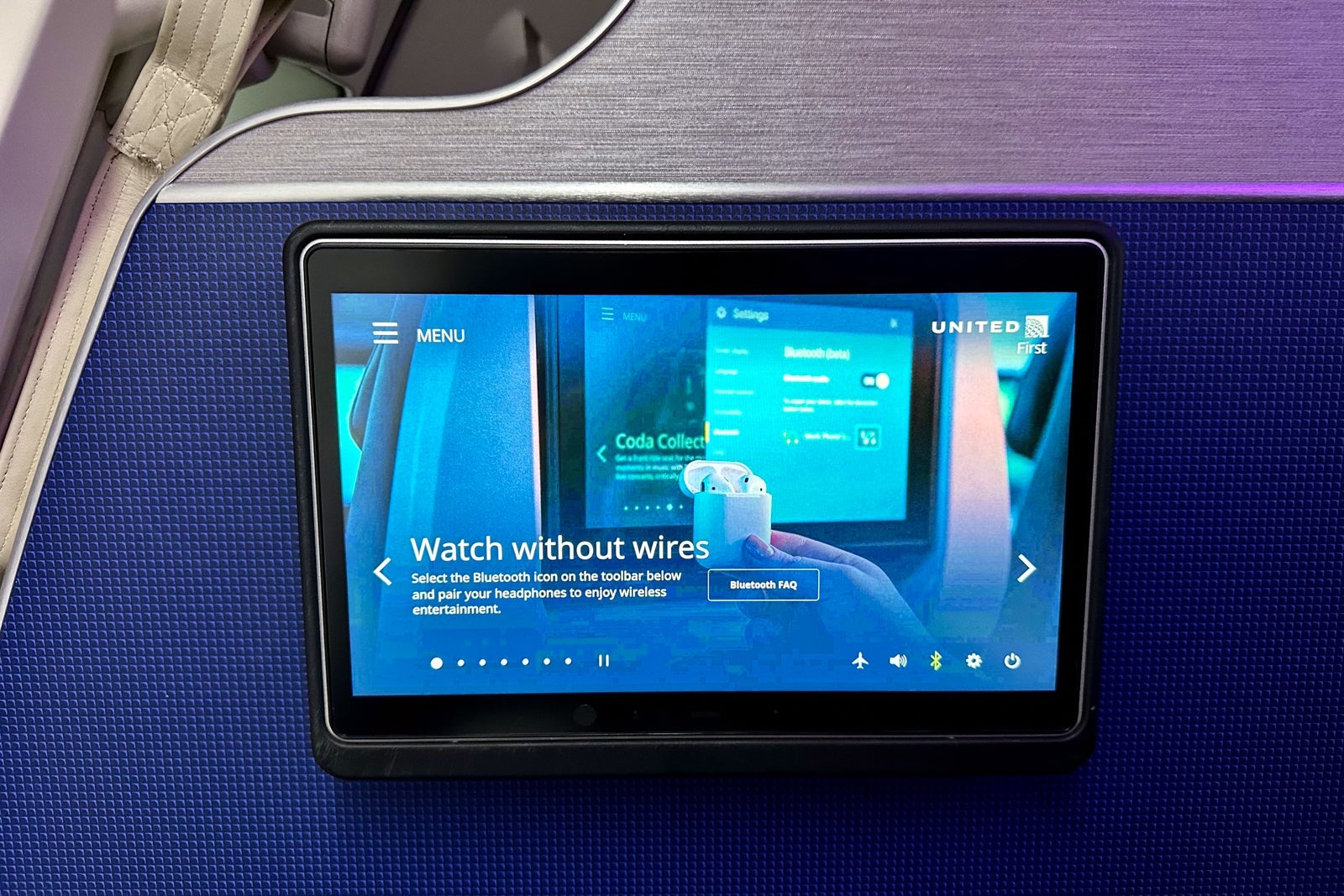 Anyone who's flown on United's international jets will be familiar with the easy-to-use user interface, but a few notable hardware and software upgrades include Bluetooth connectivity for pairing with AirPods and other wireless headphones, as well as some accessibility improvements, such as high-contrast text and magnification options.