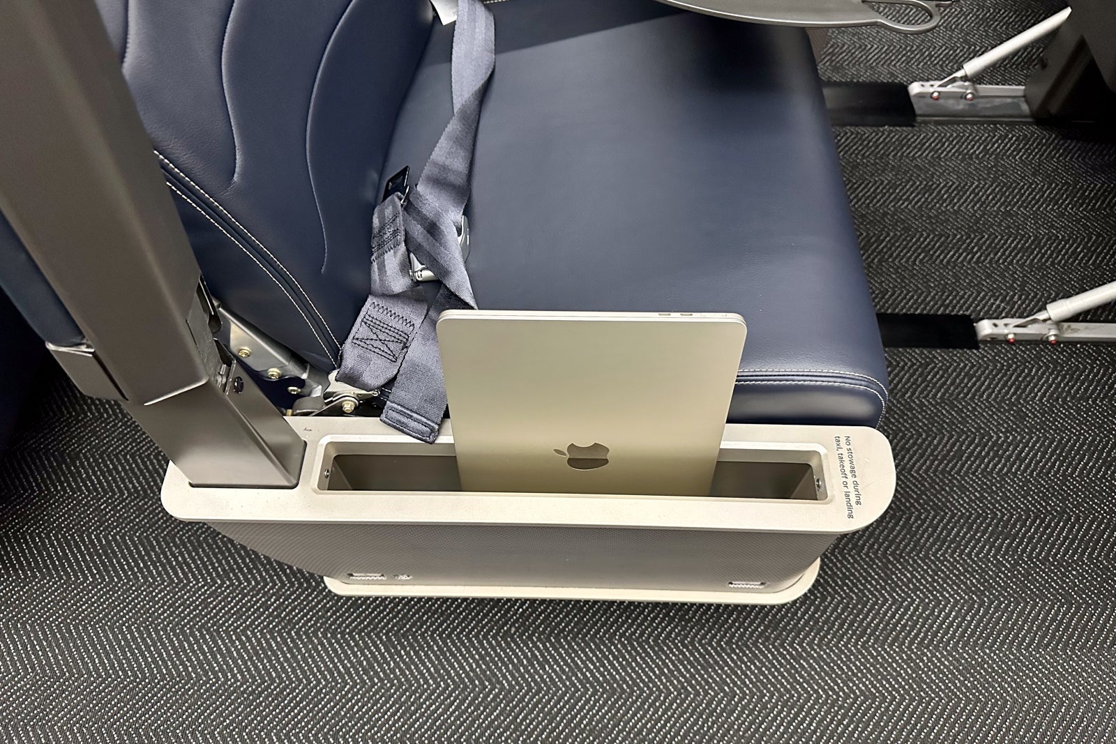 The other "bones" of the seat are largely reminiscent of the old first-class product on the Airbus A319. This includes a large and durable tray table that measures 20 inches wide and 11 inches long and features a tablet stand.