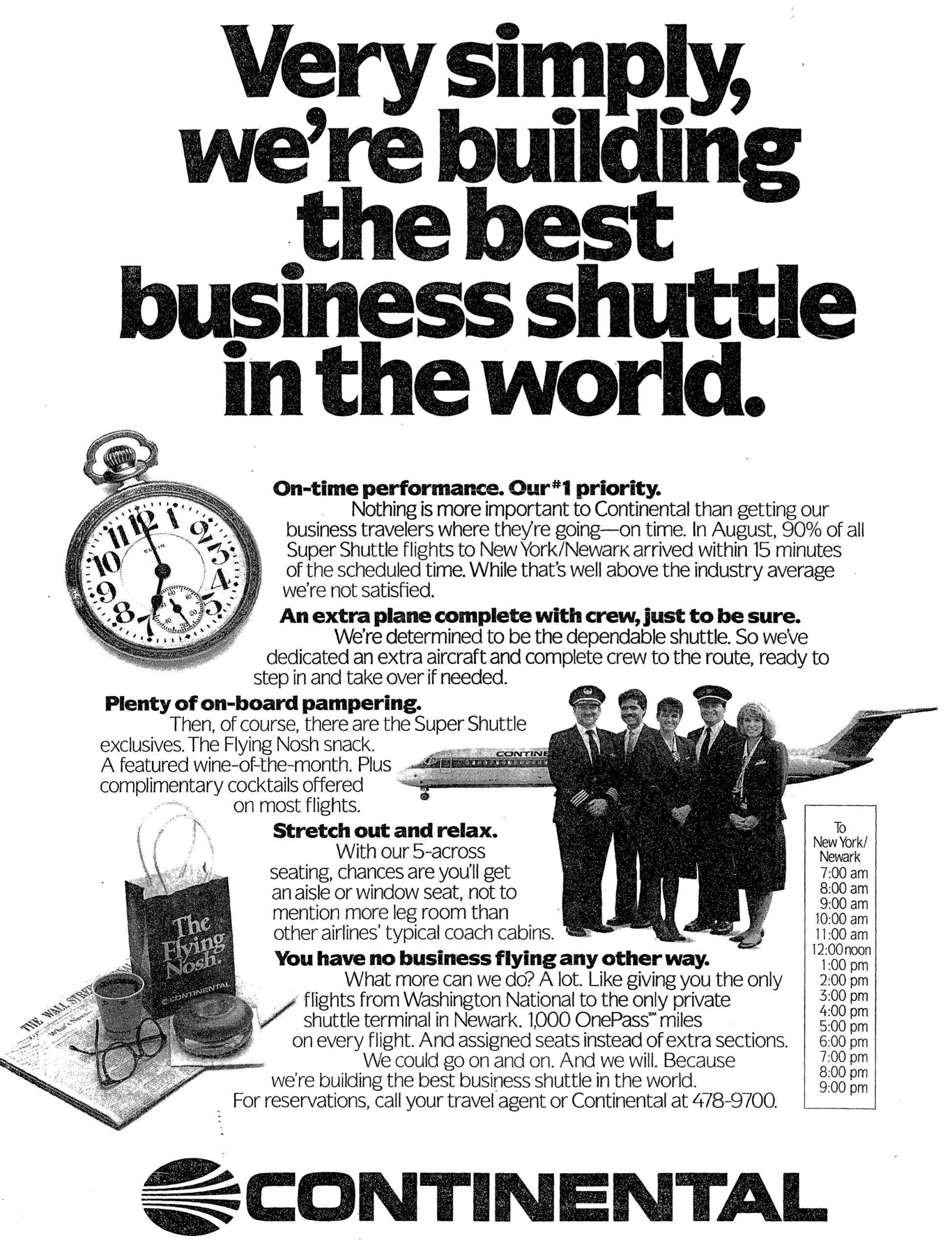 United's new Newark-Washington schedule is not the first shuttle on the route. Continental Airlines, which merged with United in 2010, offered a shuttle on the route in the 1980s and 1990s. And New York Air and People Express both operated their own shuttles before they merged with Continental in 1987.