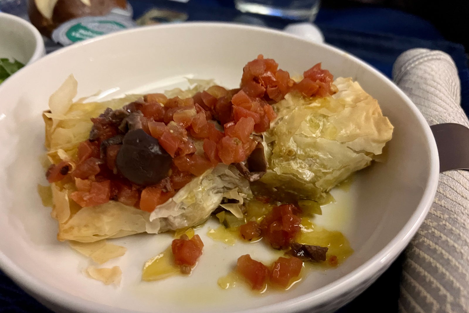 Roughly ten minutes later, another flight attendant brought a single tray of food. This included quinoa salad, Moroccan vegetable pastilla (my chosen entree) and a pretzel roll with butter. There were no hot towels, nor was there a pick from a bread basket (though a pretzel roll would've been my first choice anyway).