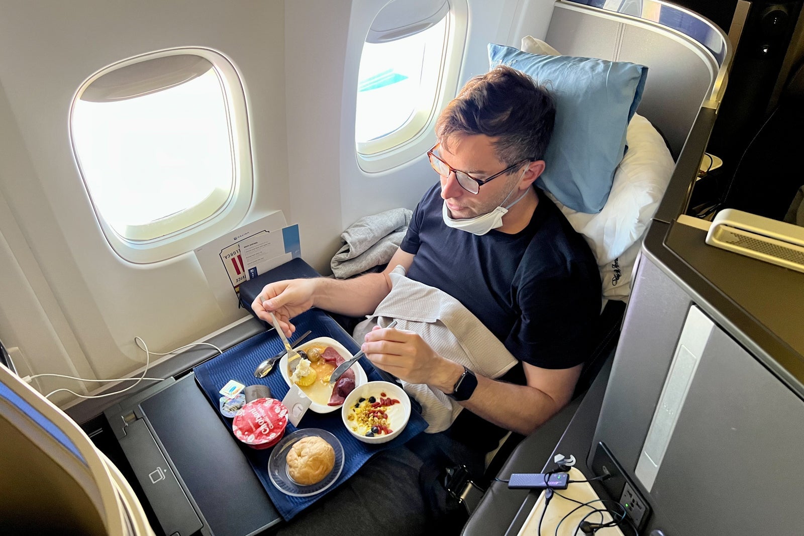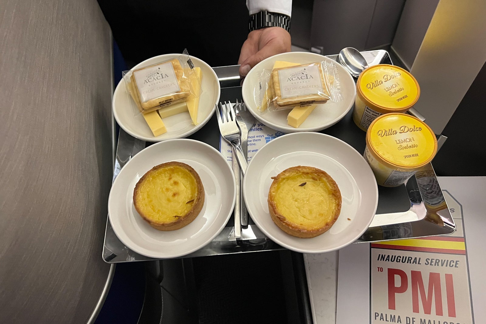 After staff cleared my plates, the purser brought around a tray of desserts. The options included a small cheese plate, an egg tart or a lemon sorbet — a far cry from the three-tiered dessert trolleys that were rolled down the aisle in pre-pandemic times.