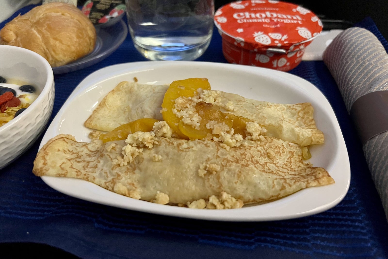 I briefly dozed off for an hour or two after dinner, and then it was time for breakfast — there's not enough time to sleep and eat (twice) on a seven-hour transatlantic hop. I was still too full from dinner to enjoy the meal, so I just took a picture of the apple ricotta crepes.