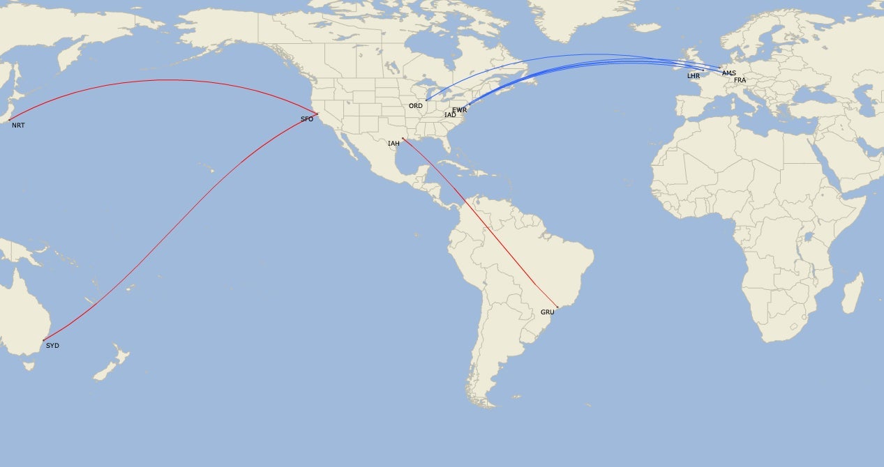 The only exceptions are a Boeing 737 flying between Guam (GUM) and Tokyo Narita (NRT), and a Boeing 767-300ER flying between Houston Intercontinental (IAH) and São Paulo Guarulhos (GRU) for just the first three days of May, Cirium shows.
