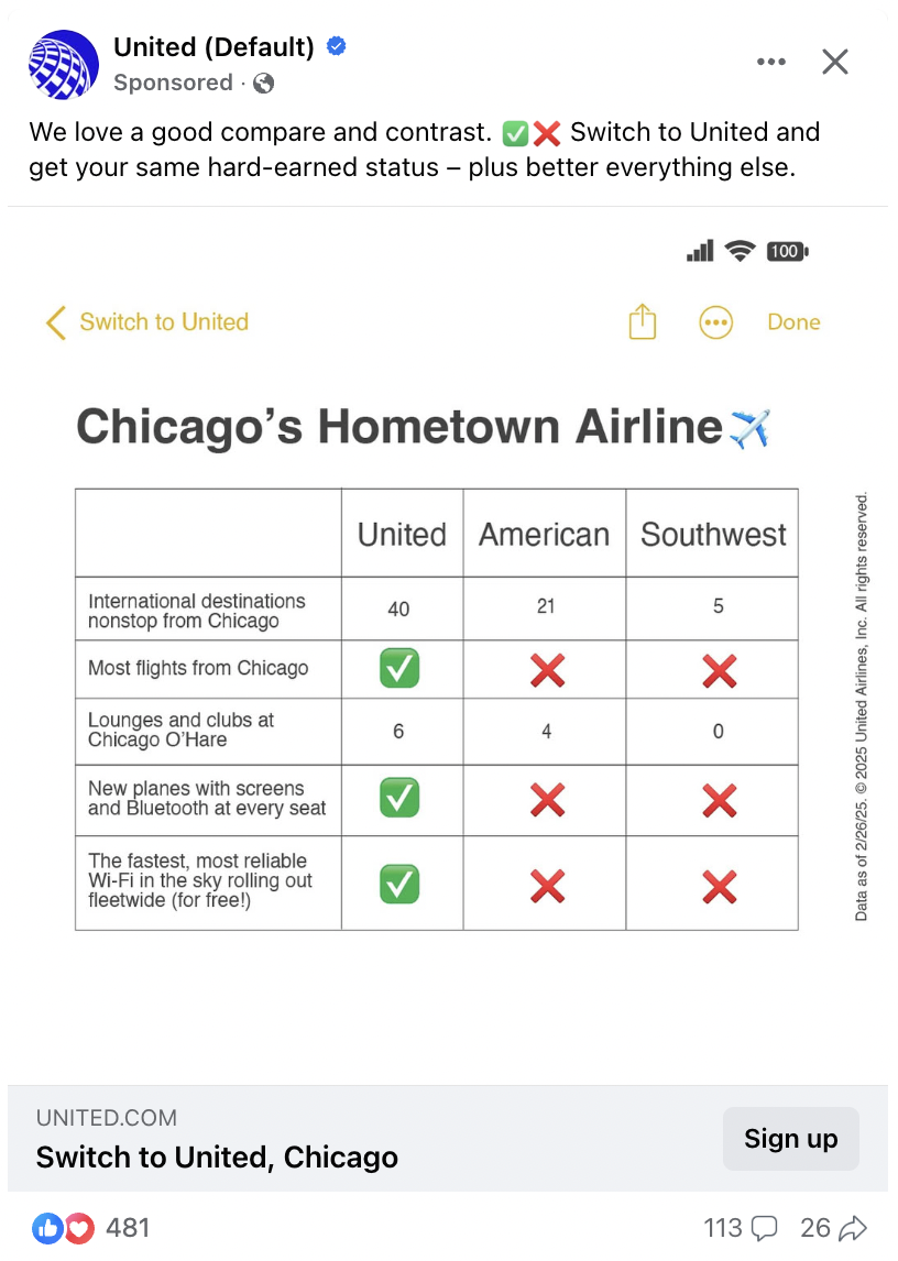 The carrier has also embarked on a digital campaign to inform travelers that it has more flights, international destinations and lounges than American or Southwest in Chicago. United even published an Instagram post that cites an American Airlines press release about American's double-digit growth in Chicago this year. (United says it has more.)