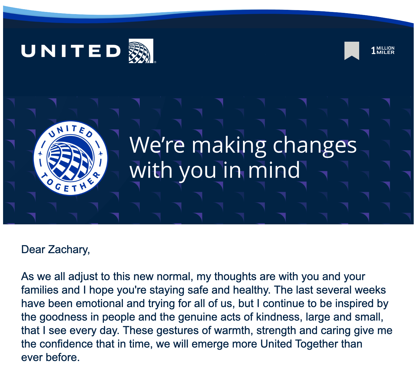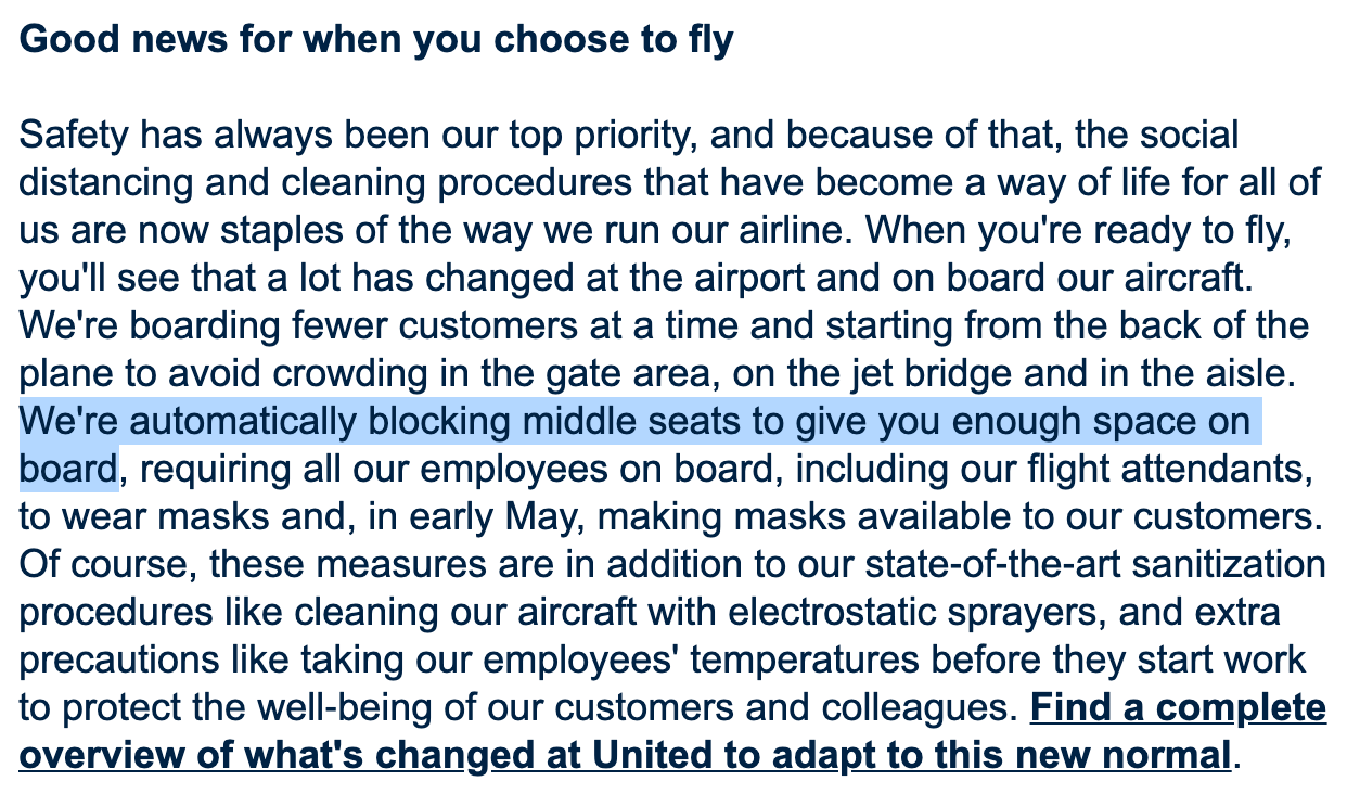A number of readers have reached out to note that United, too, is blocking middle seats, referencing an April 29 email from Chief Customer Officer Toby Enqvist, titled "We're making changes with you in mind":