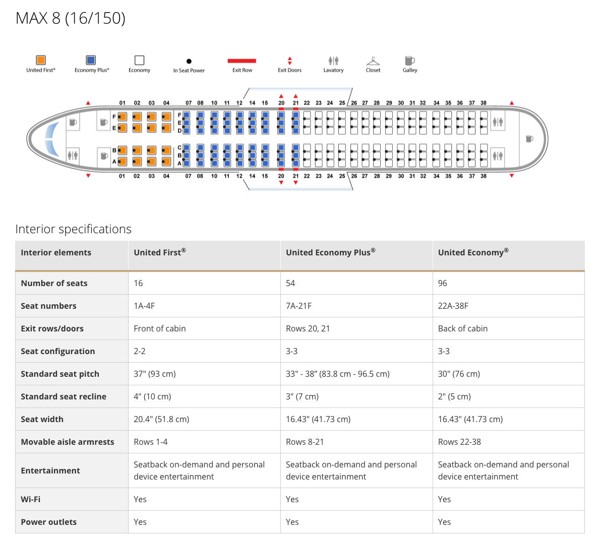 In addition to the plane's first batch of routes, United also briefly posted what appeared to be the MAX 8's seat map and inflight amenity guide over the weekend, though those have since been removed. A previous version of the carrier's website cached by Google notes that the plane will feature 166 seats, as well as a slew of passenger-friendly amenities.