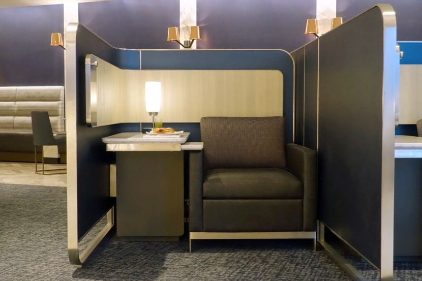 Polaris Lounge guests can enjoy their meals at shared tables or in these private pods.