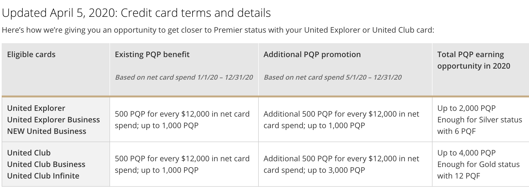 For 2020, United is doubling the number of PQPs you can earn with its consumer and small business United Explorer cards, such as the United Explorer Card, and quadrupling the number of PQPs you can earn with its consumer and small business Club cards, such as the United Club Infinite Card.